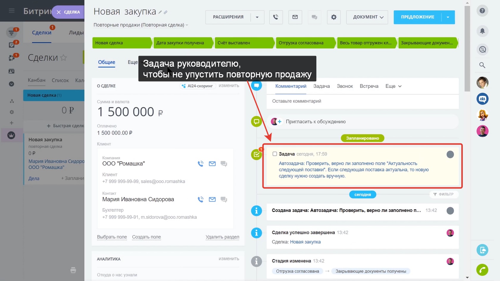 - Повторные продажи. Чтобы менеджеры не забывали про повторные продажи, после покупки клиентом CRM-система затребует у менеджера дату следующего контакта с клиентом и проведёт менеджера по шагам.