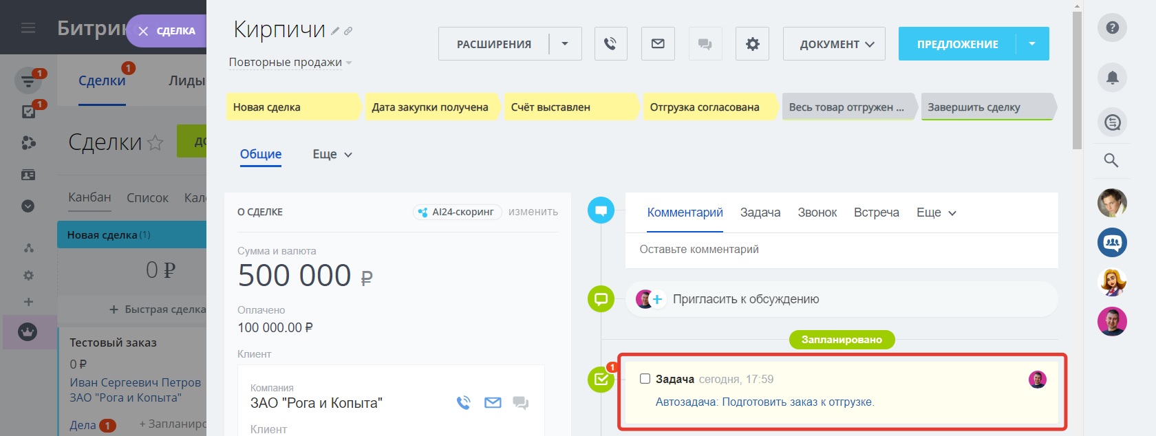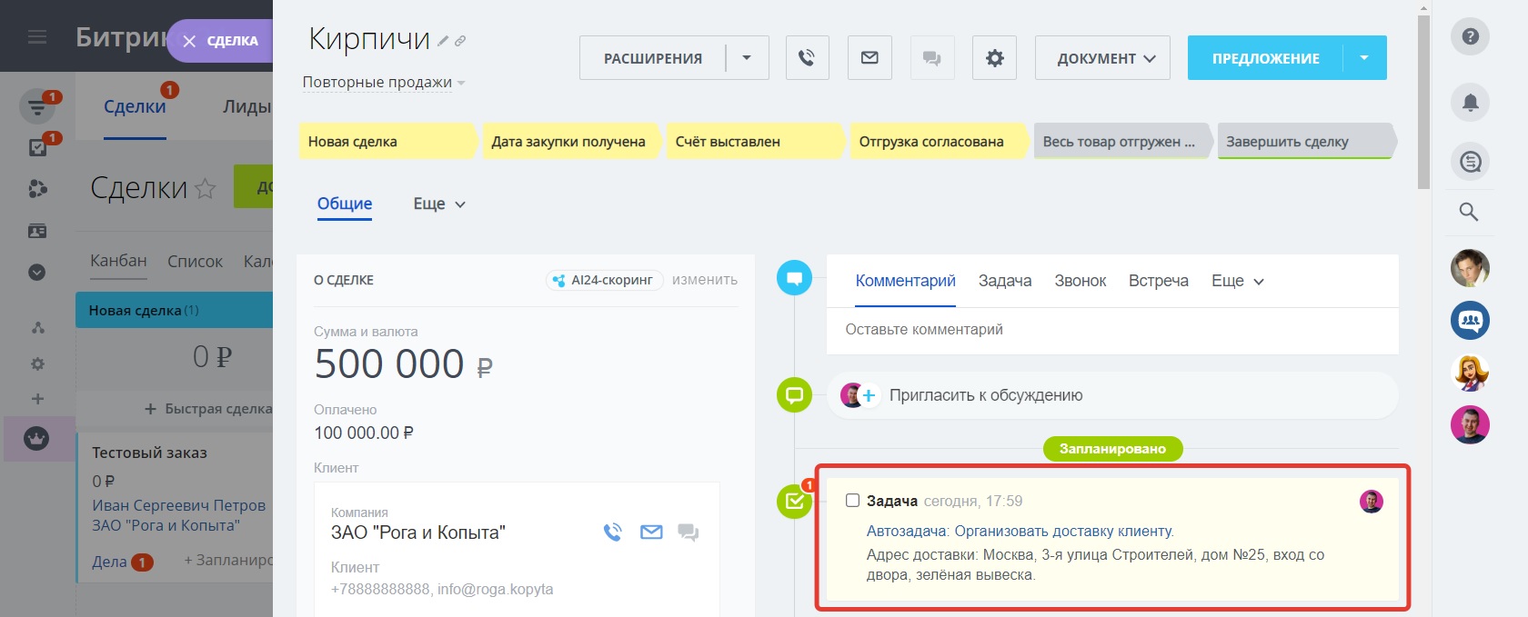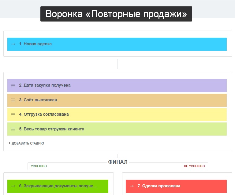 - автоматическая постановка задач менеджерам в зависимости от стадии;