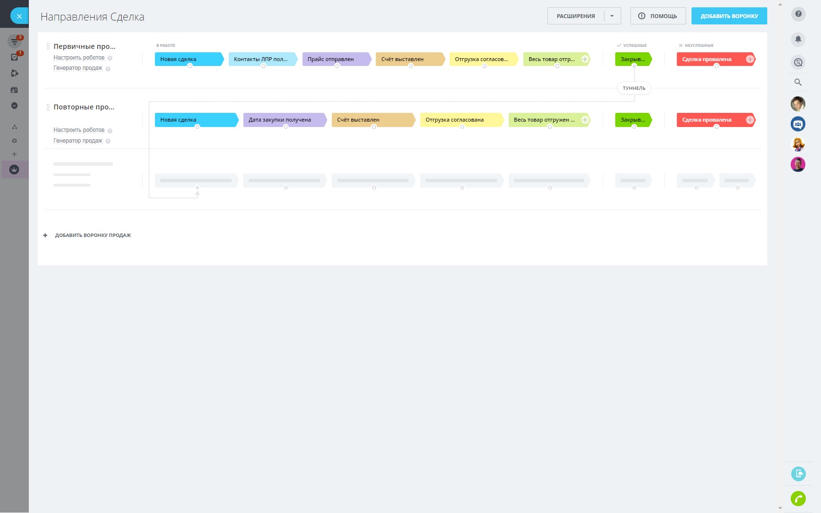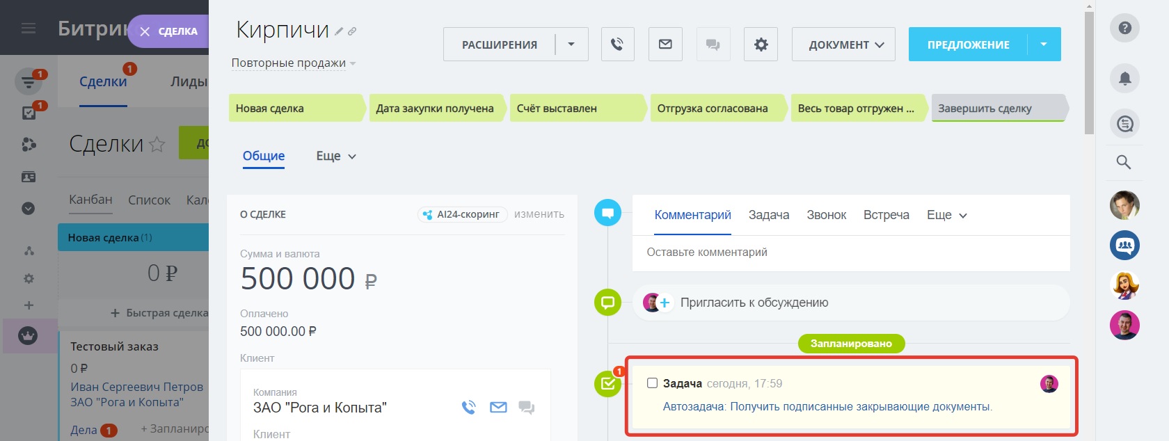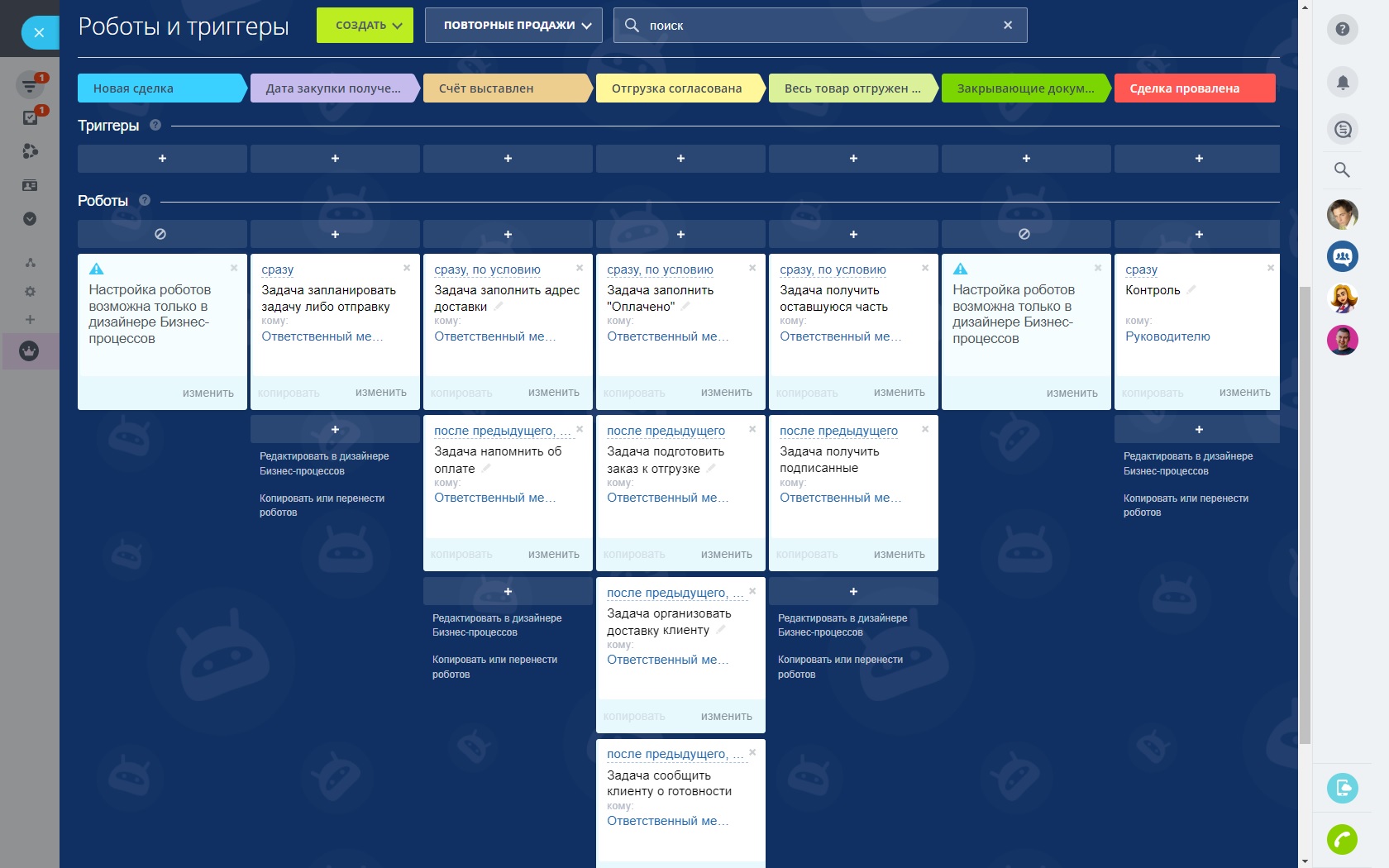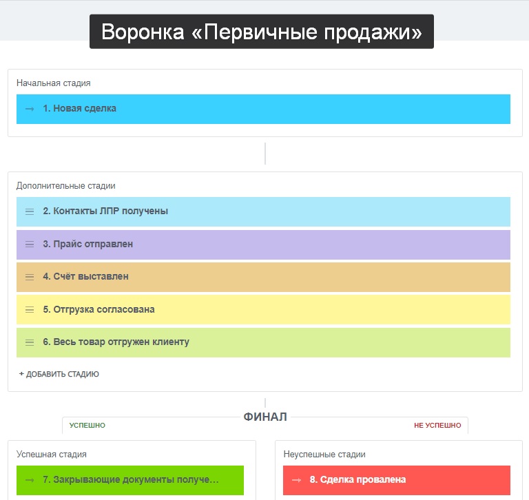 - автоматическая постановка задач менеджерам в зависимости от стадии;