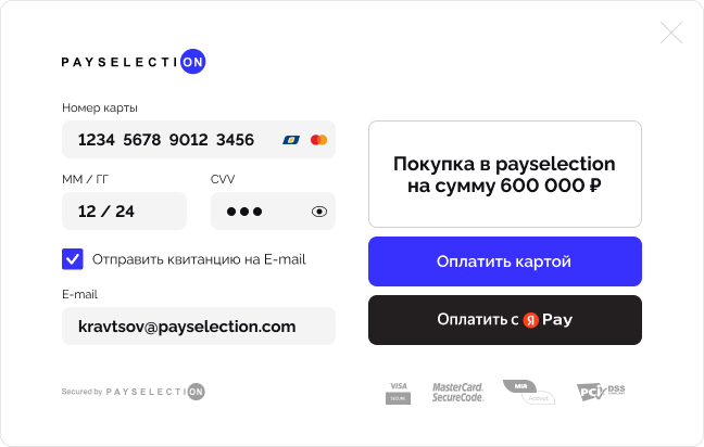 Платежный модуль PAYSELECTION для приема быстрых и удобных оплат на вашем сайте всеми популярными методами: VISA, MASTERCARD, МИР, UNIONPAY, YANDEX PAY, МТС PAY, MIR PAY, СБП, QR-код