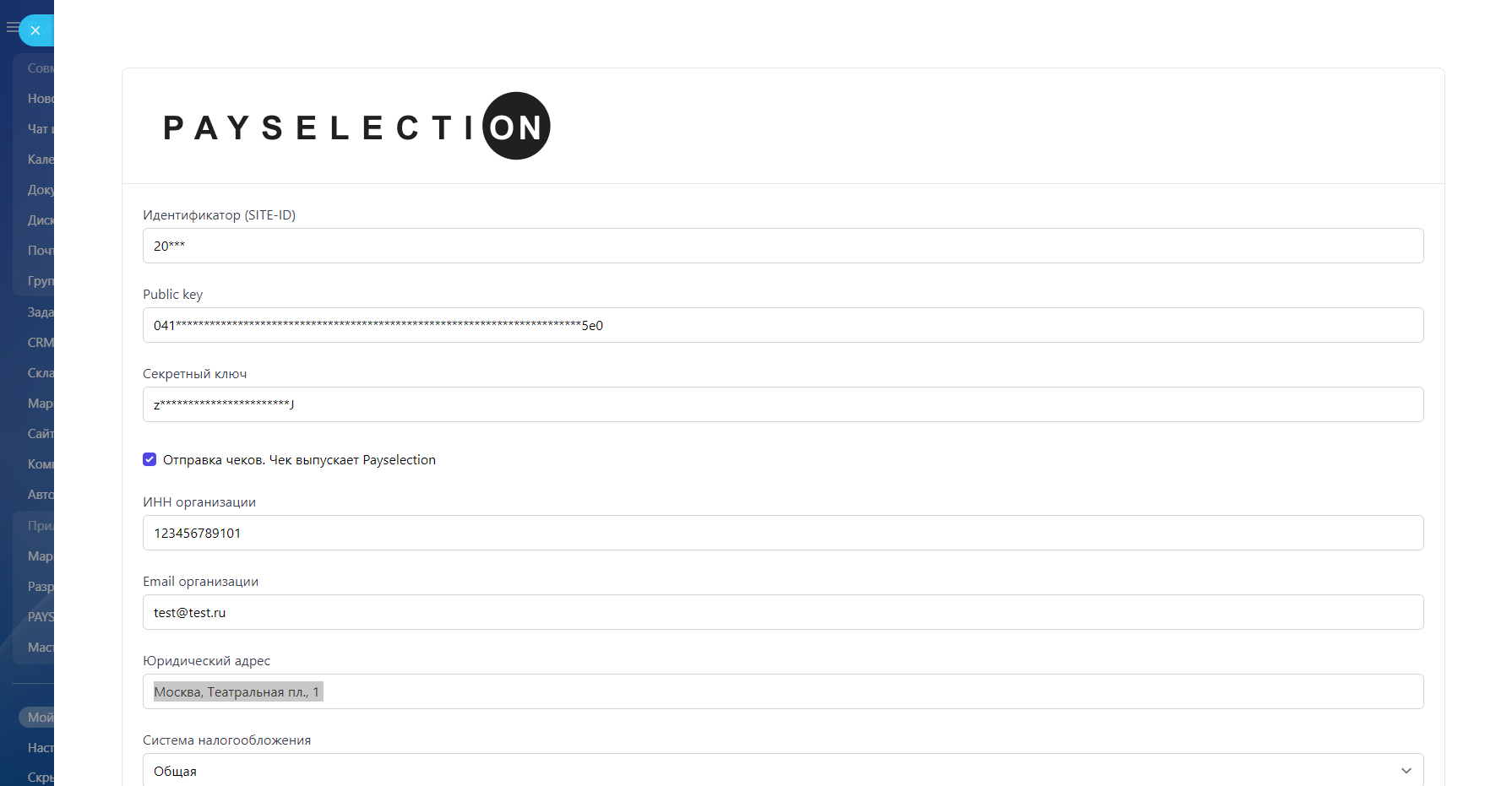 Интеграция соответствует требованиям 54-ФЗ. Для этого в процессе интеграции необходимо заполнить поля и из выпадающих списков выбрать систему налогообложения и прочие параметры необходимые для формирования чека.