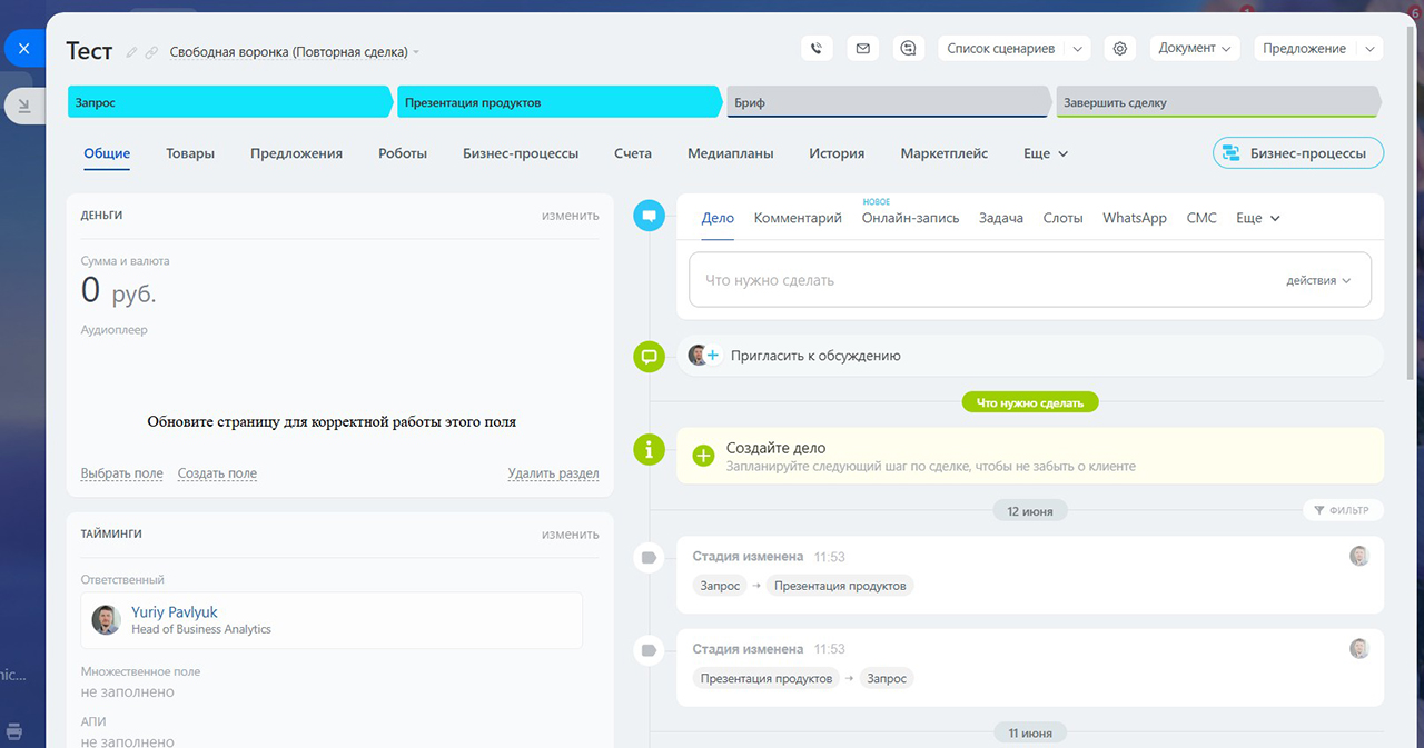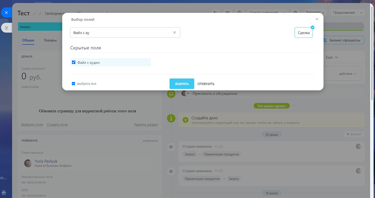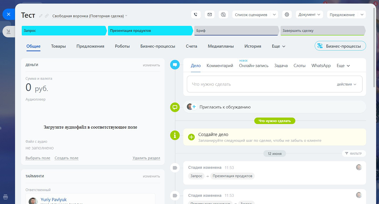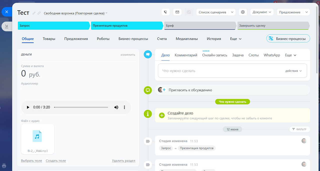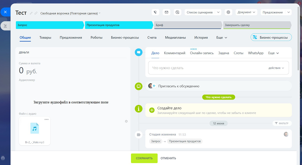 Но зачастую сотруднику, работающему с лидом, сделкой, смарт-процессом, важно иметь возможность прослушать аудио (это может быть запись телефонного звонка или инструкция в аудиоформате).