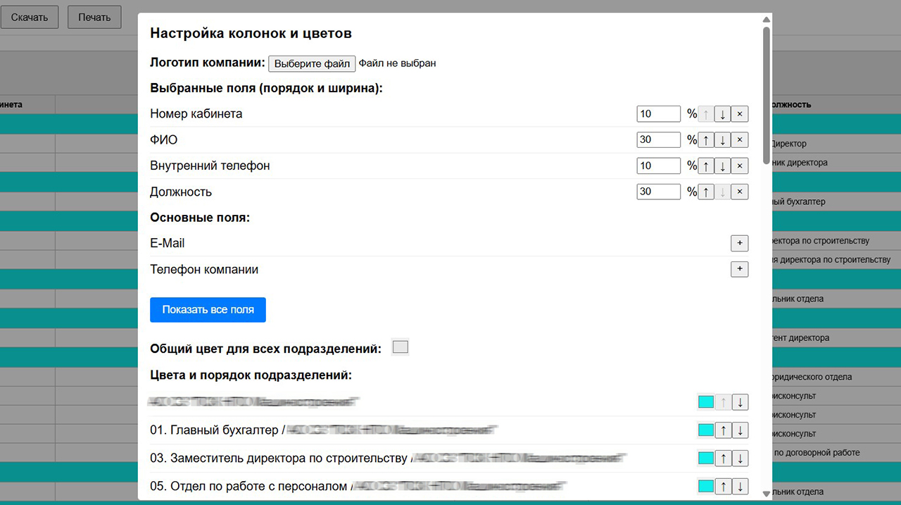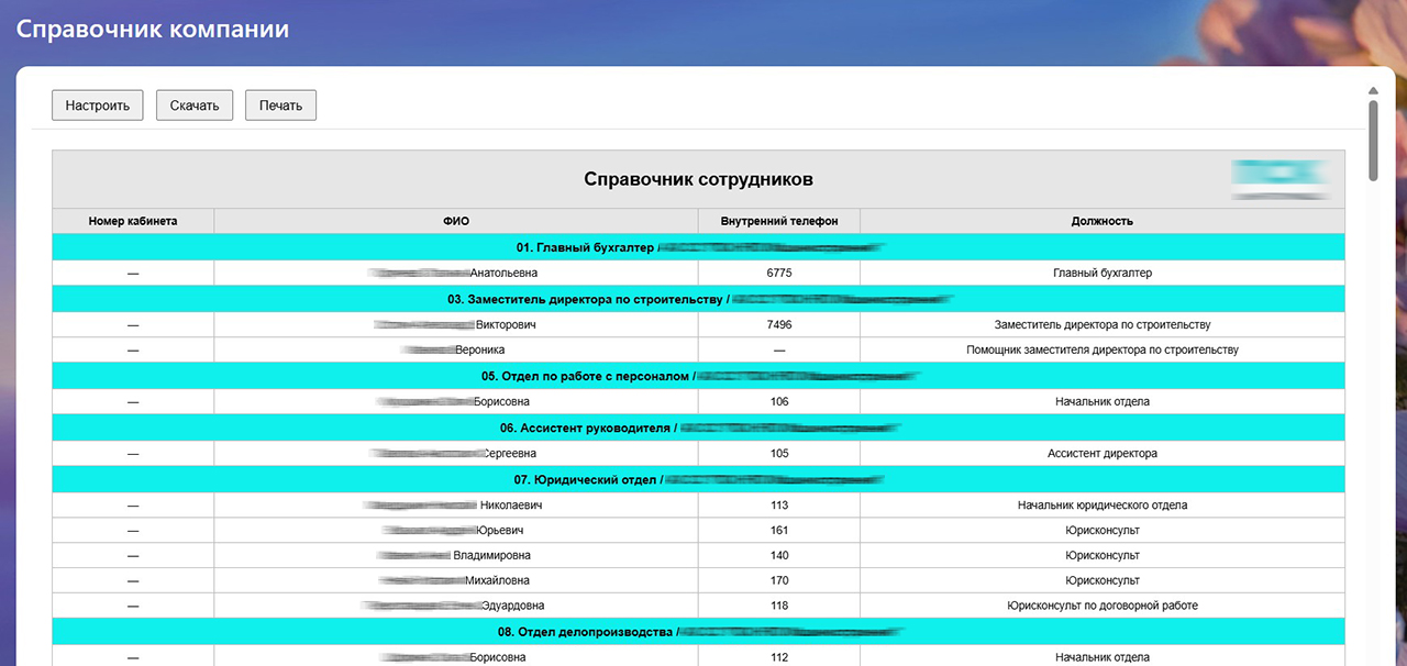 Компактная настраиваемая таблица с данными сотрудников (ФИО, должность, телефоны и др.). Сортировка по отделам и алфавиту. Можно открыть на портале, скачать в PDF, распечатать.