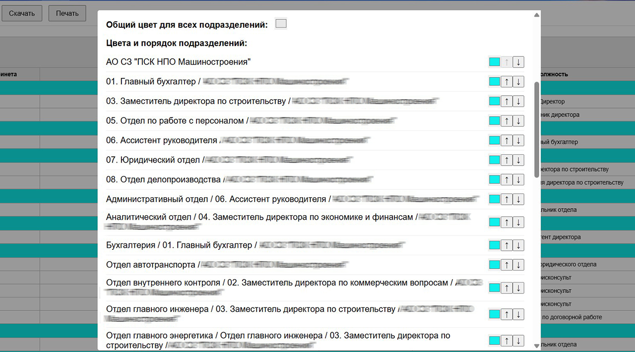 Можно указать корпоративный цвет для всей таблицы либо различные цвета для разных подразделений.