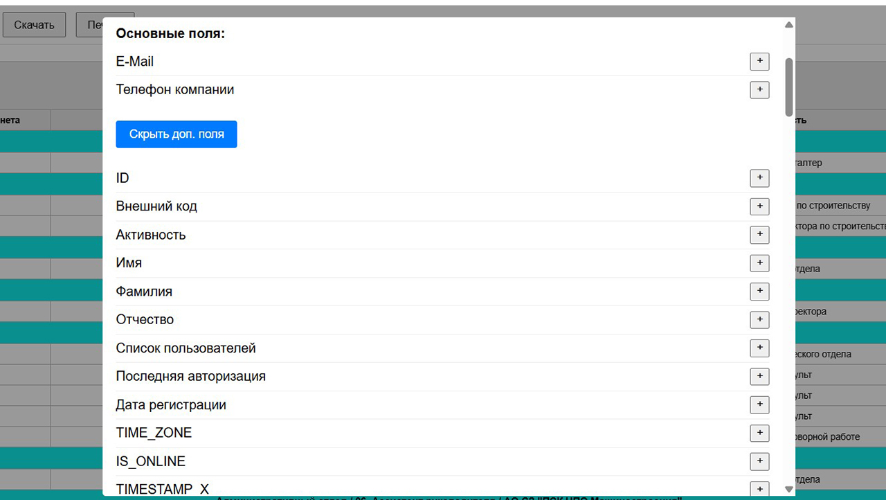 С помощью нашего приложения можно составить компактную таблицу (да еще и с фирменными цветами и логотипом), содержащую данные из штатных и пользовательских полей в карточках юзеров портала.