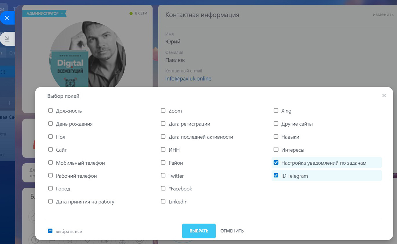 При этом каждый пользователь в своей карточке, в поле “Исключения для уведомлений в Telegram” может указать, какие уведомления ему не нужны.