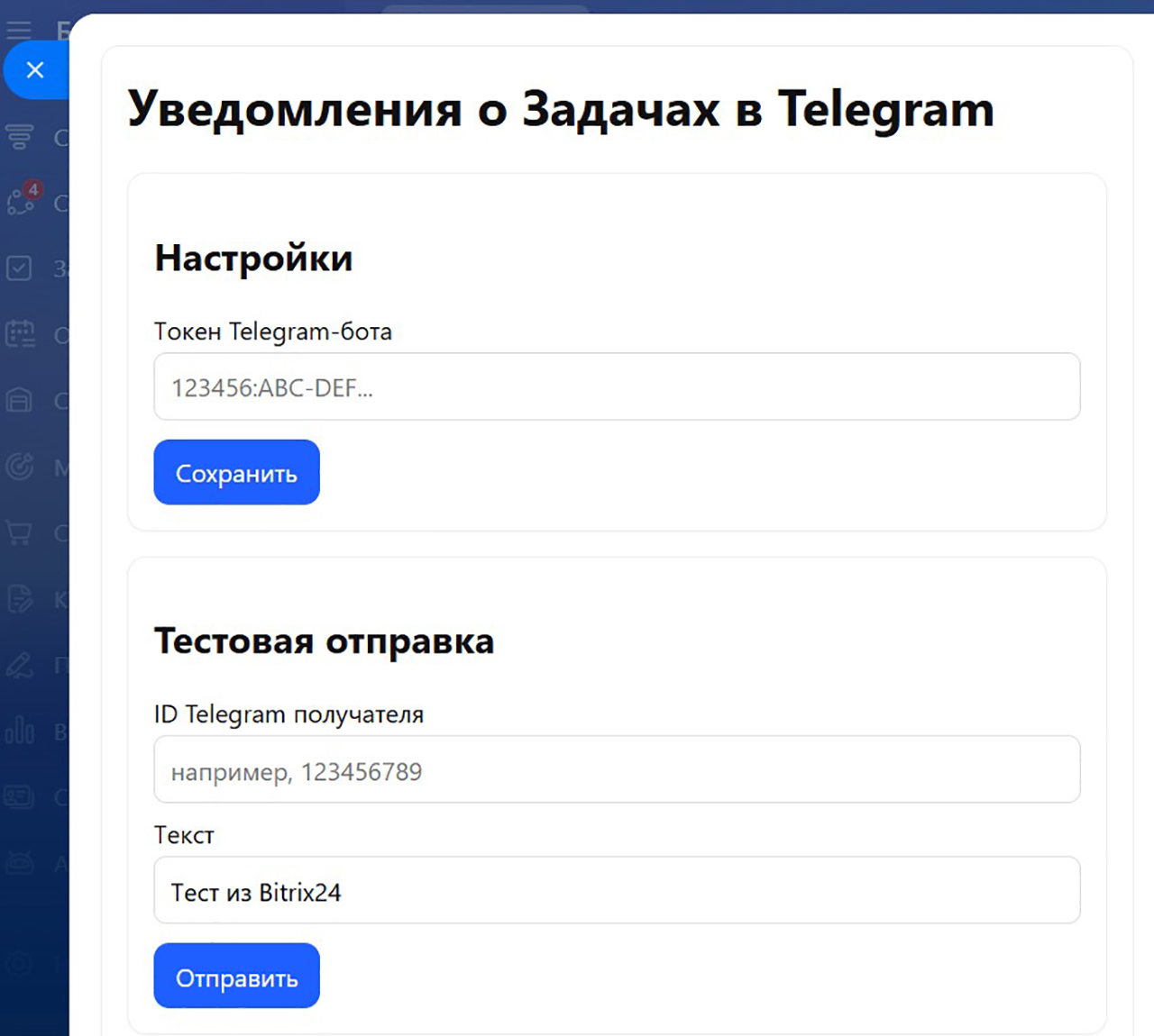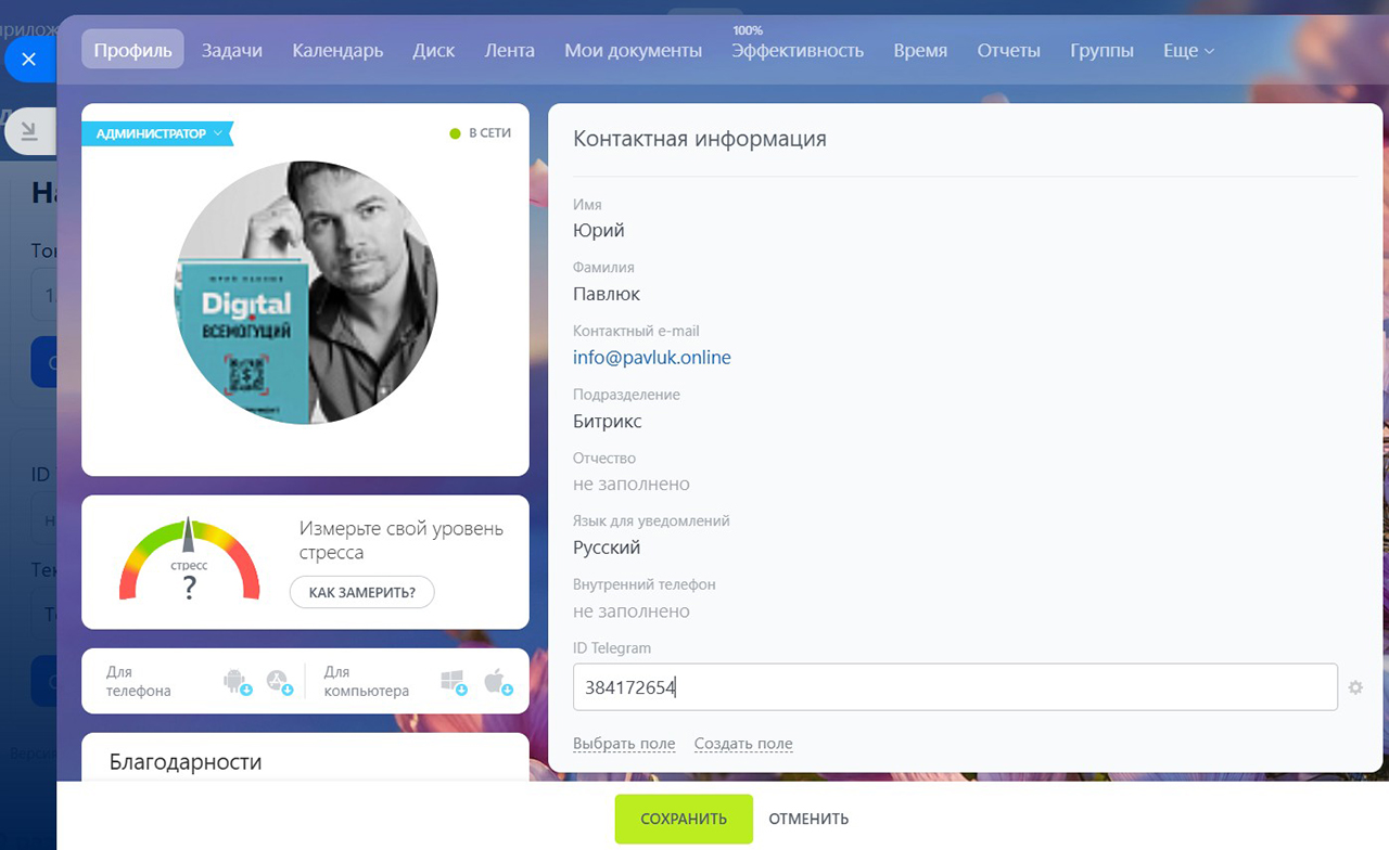 Также каждому, кто хочет получать уведомления, необходимо указать ID своего Telegram-аккаунта в карточке Пользователя в поле “ID Telegram”.
