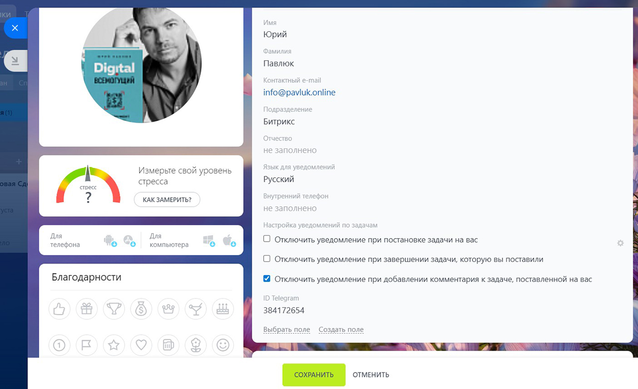 При необходимости любой пользователь портала может самостоятельно скорректировать настройки уведомлений в Telegram в своей карточке Пользователя.