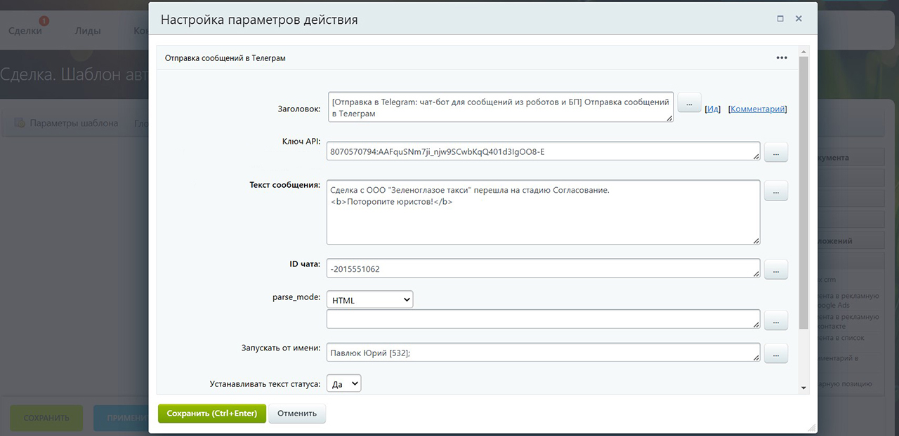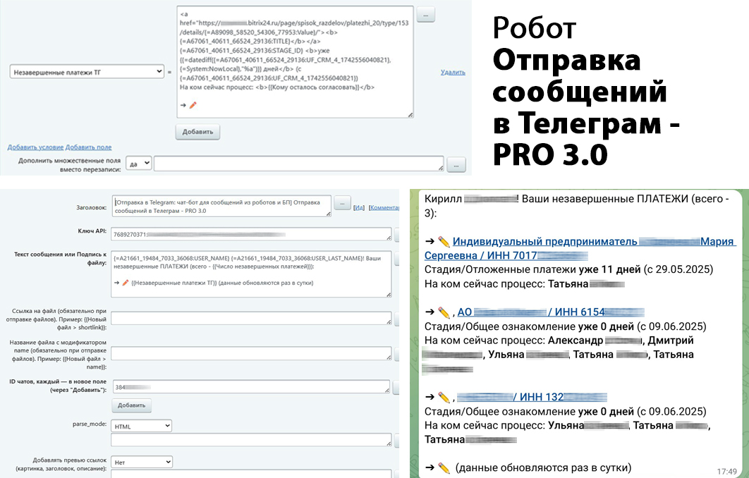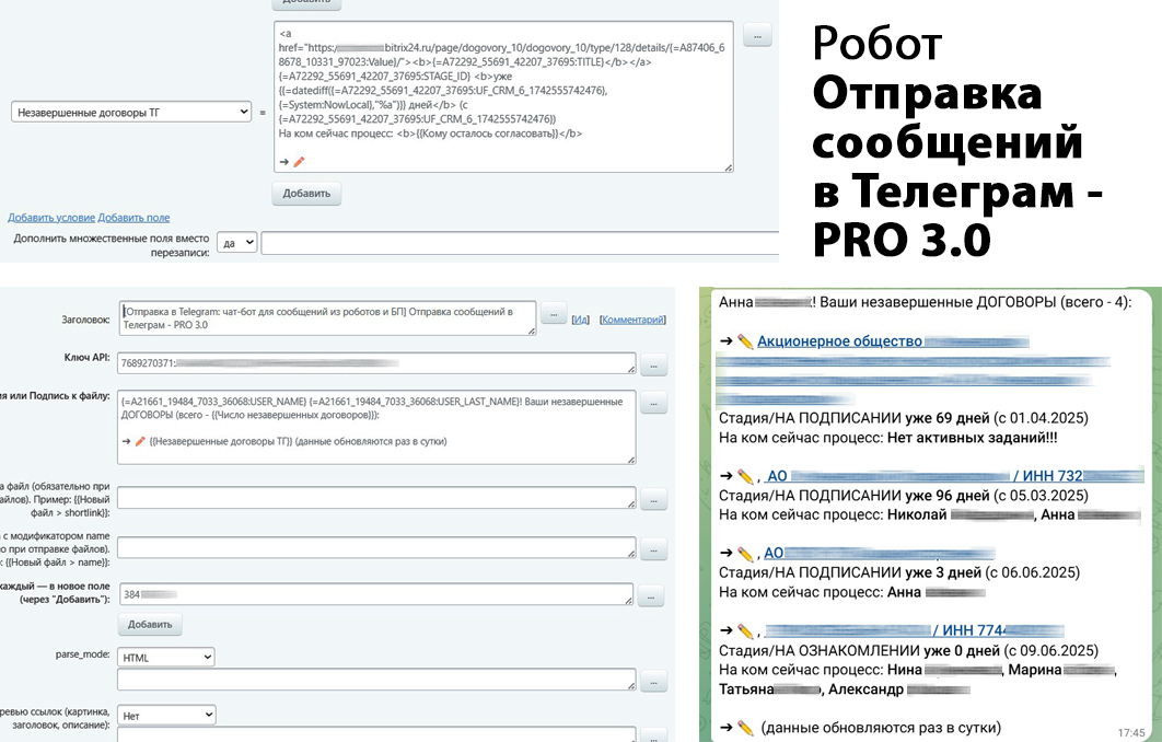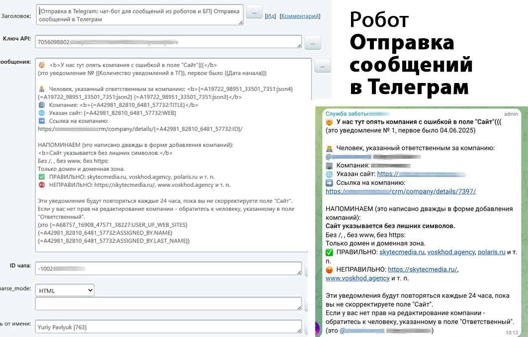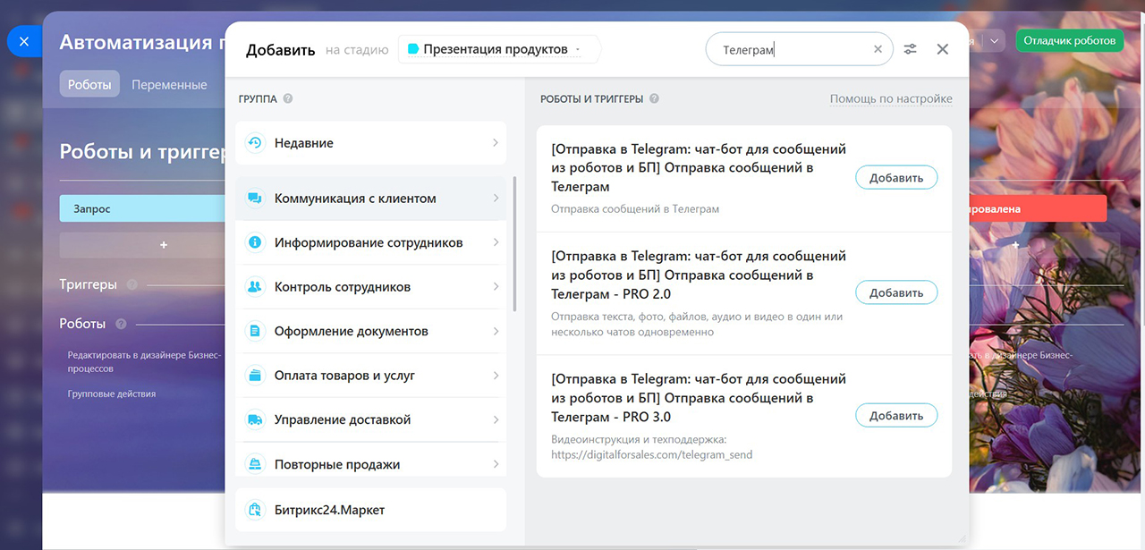Функционал позволяет получать уведомления о работе вашего Битрикс24 в группах/чатах Telegram, а также персонально, от Телеграм-бота.