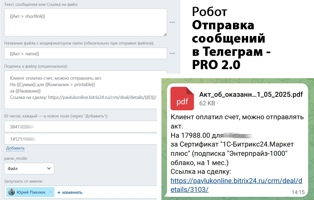 Поле “Текст сообщения или Ссылка на файл” обеспечивает вариативность PRO-версии. Но в будущем мы сделаем функционал еще удобнее, разбив его на 2 самостоятельных поля.