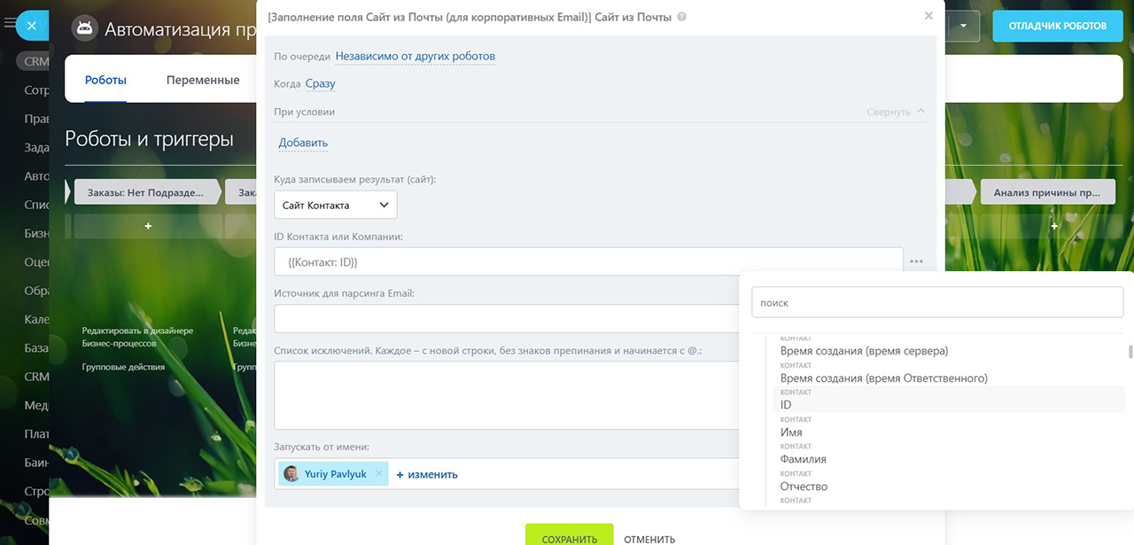С помощью Робота или Активити можно проверять все новые Контакты (например, созданные из входящих писем или заявок через CRM-форму) и автоматически заполнять в Контактах поле Сайт.