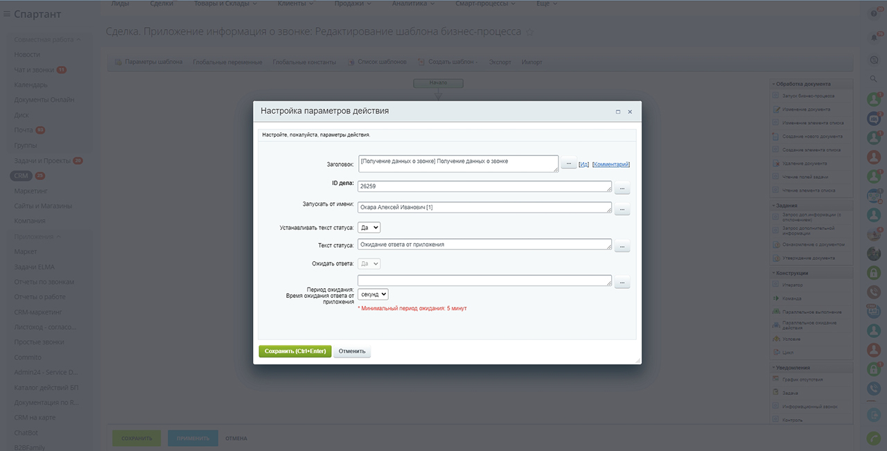 Также, данное приложение возвращает длительность разговора в секундах, что позволяет формировать отчетность по количеству разговоров с клиентом.