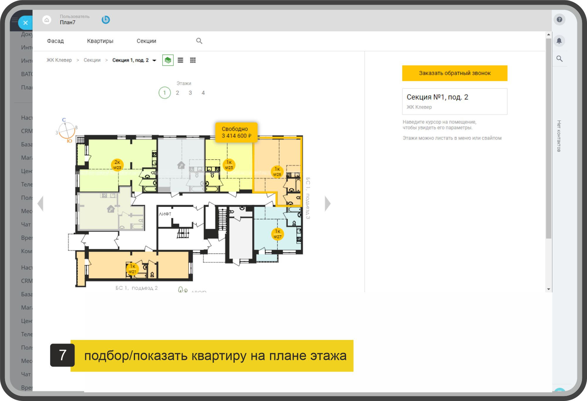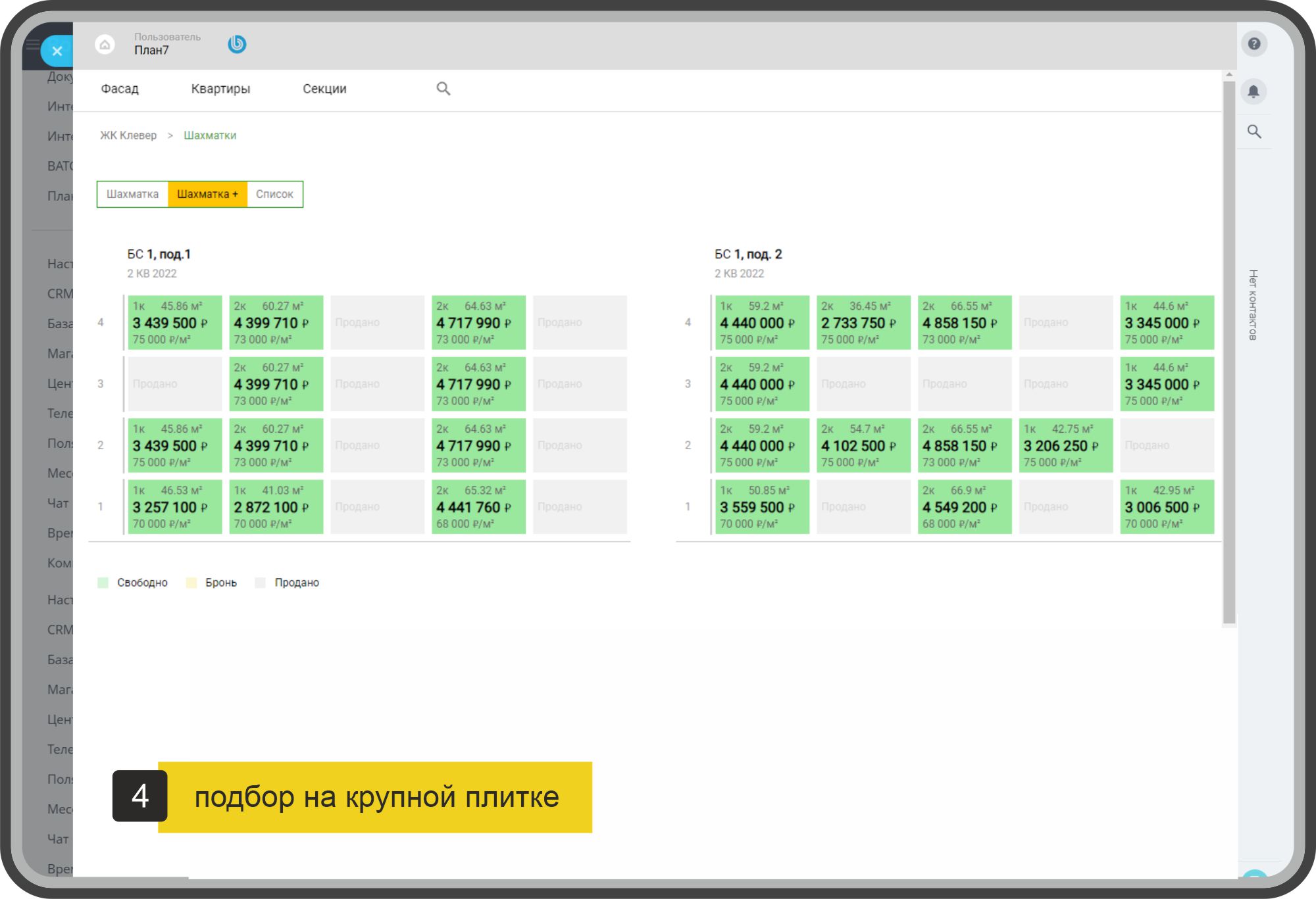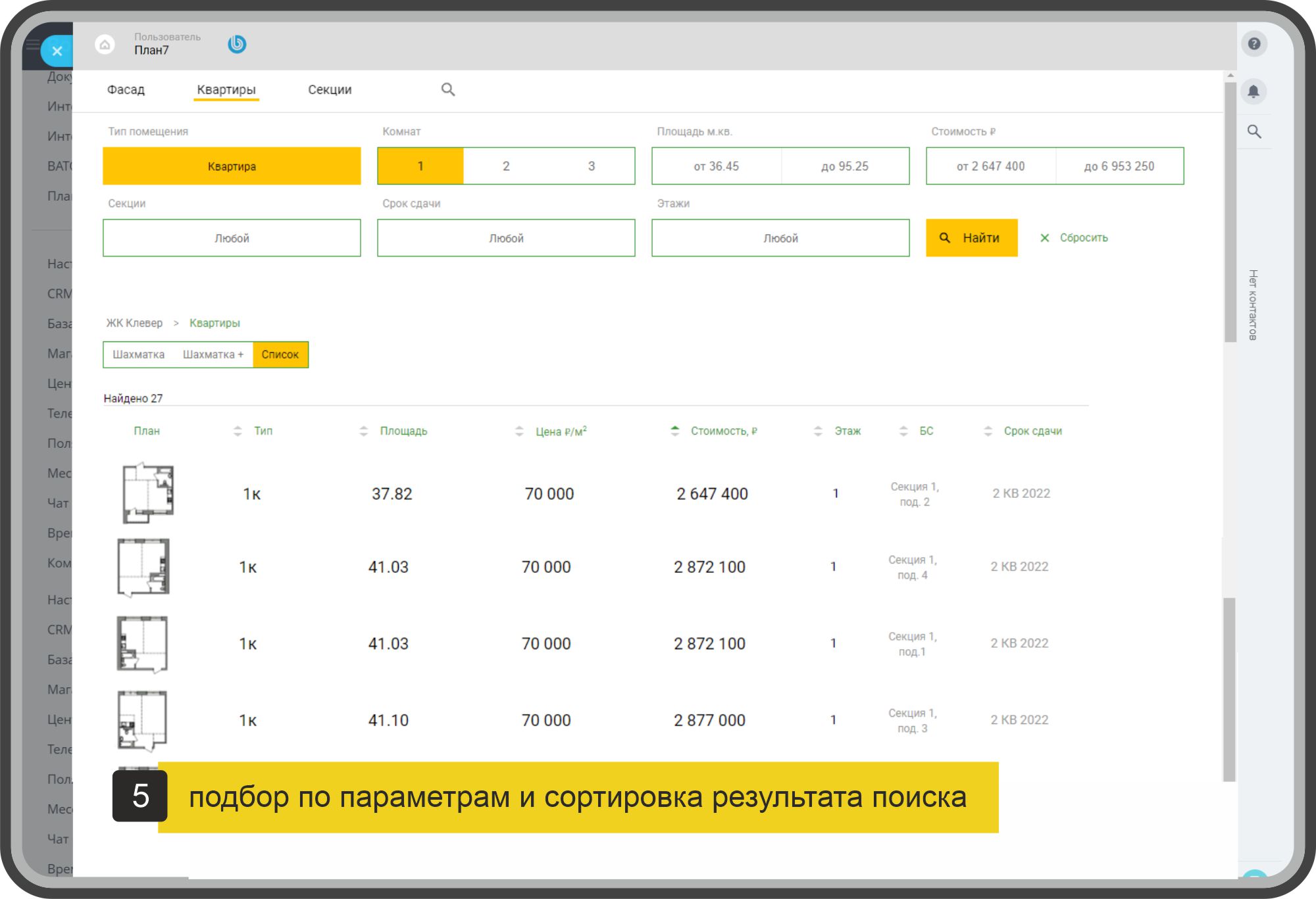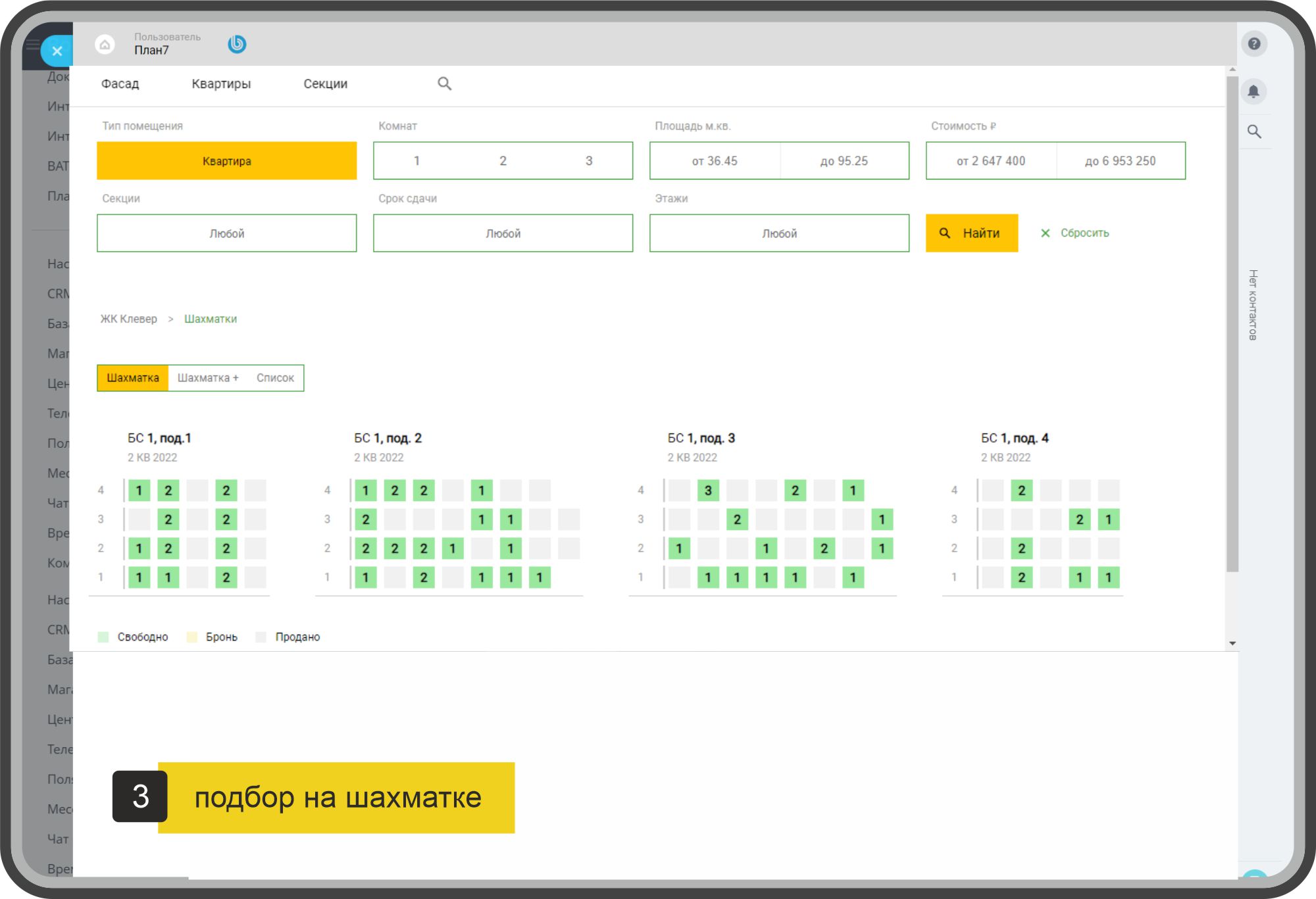 - Подбор квартир по параметрам, на фасаде, на шахматке, на интерактивных планах.