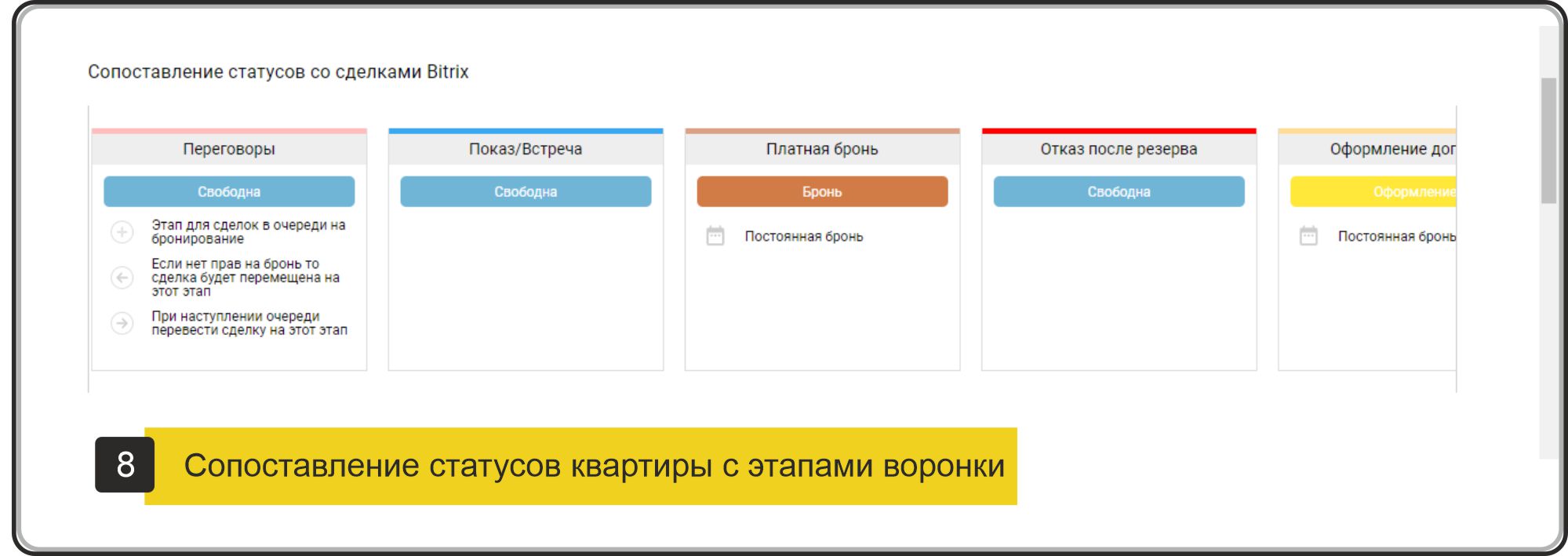 - автообновление статуса квартиры в зависимости от этапа воронки