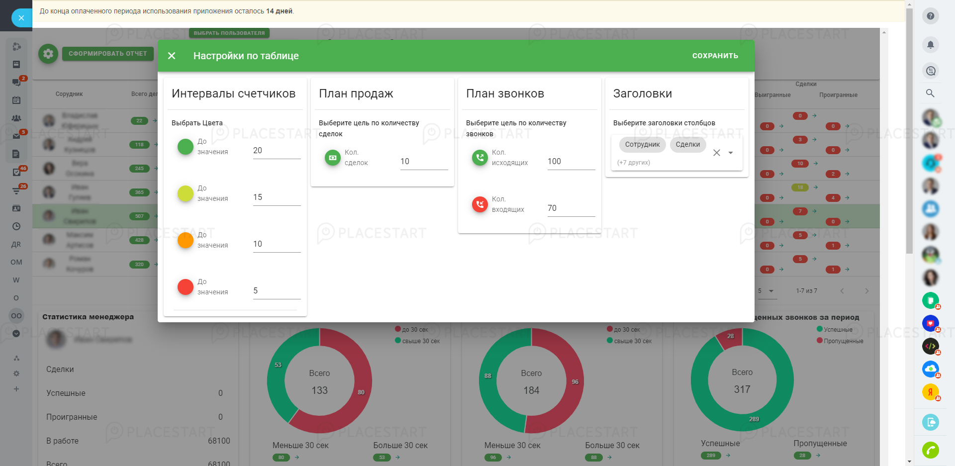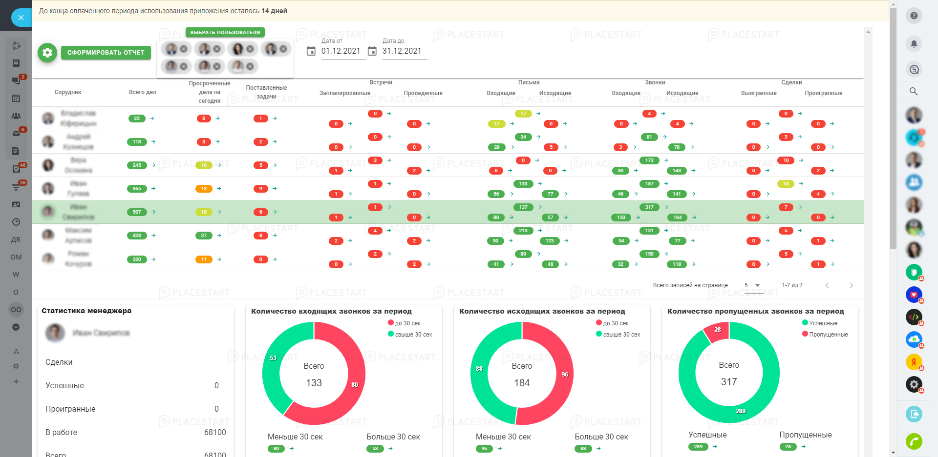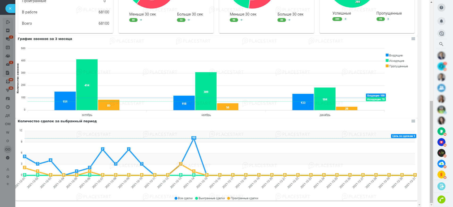 Статистика менеджера по сделкам в цифрах, эффективность входящих и исходящих звонков, количество пропущенных звонков.