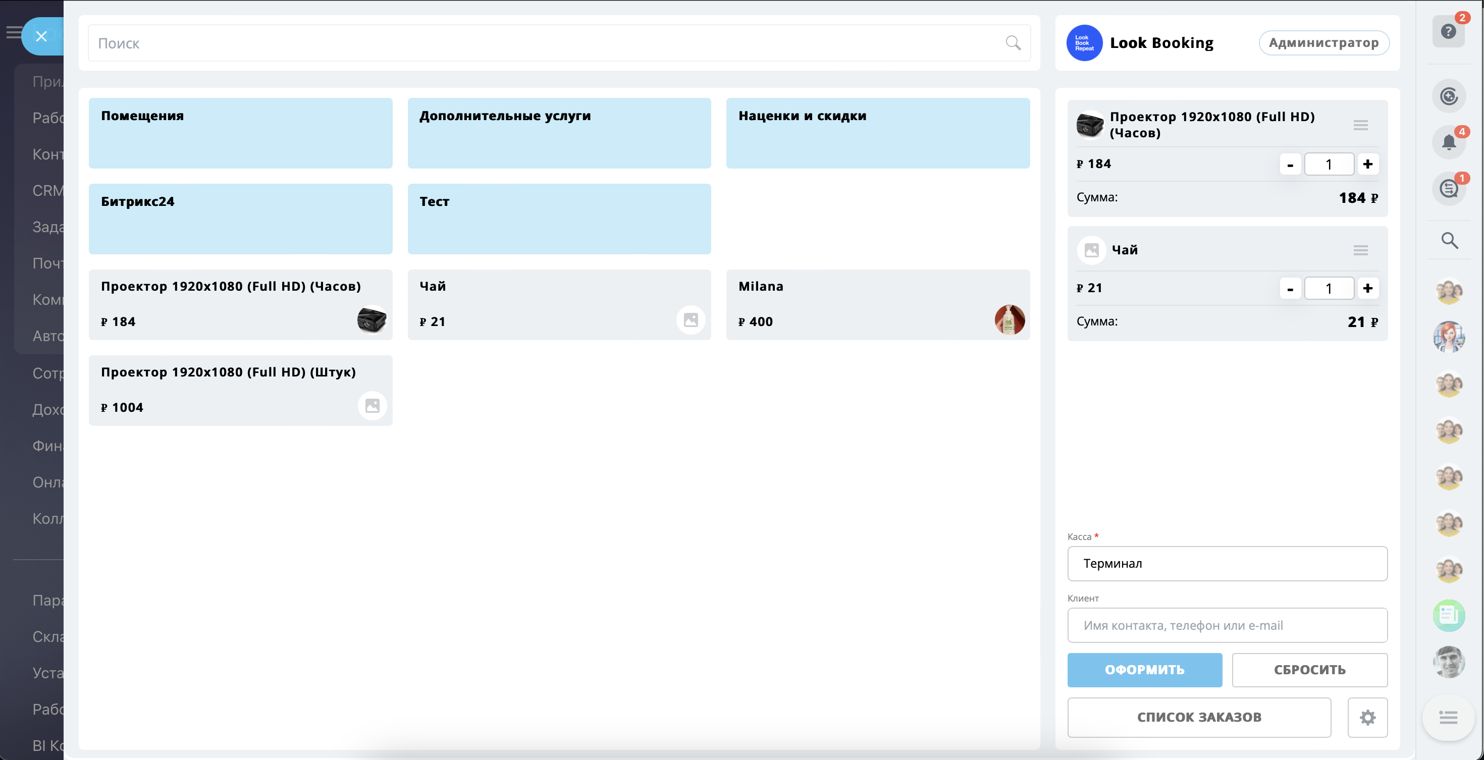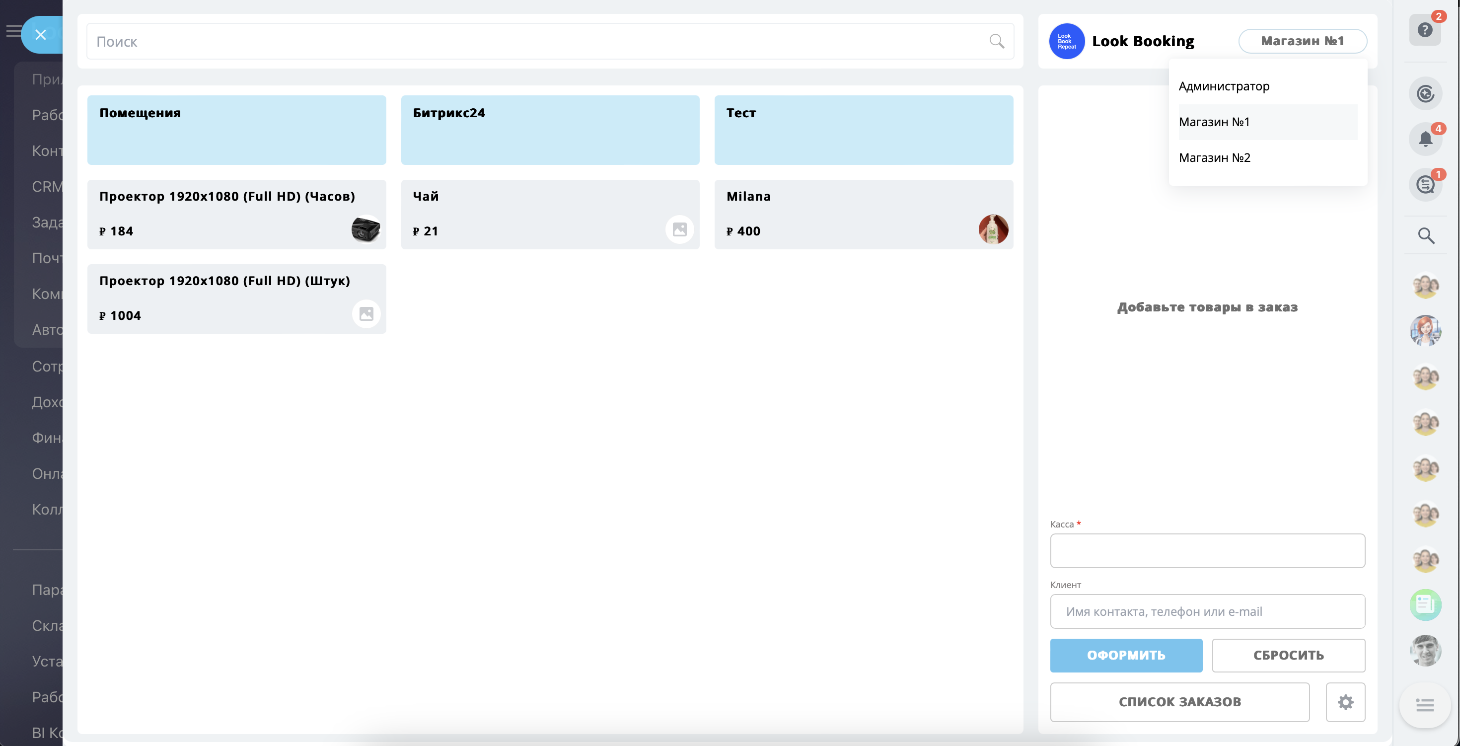 Добавляйте нужные товары и услуги, выбирайте кассу и система автоматически создаст сделку и счет на основании заказа. Функция реализована на базе сущностей Битрикс24 “Сделки“ и "Счета" – это означает, что созданные сделки и счета попадут в отчеты.