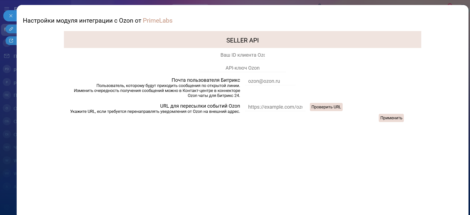 Используя приложение Озон чаты для Битрикс 24, Вы сможете продолжить пользоваться и другими сервисами, использующими уведомления от Озон (к примеру, topseller) для этого предусмотрена возможность переадресации уведомлений.