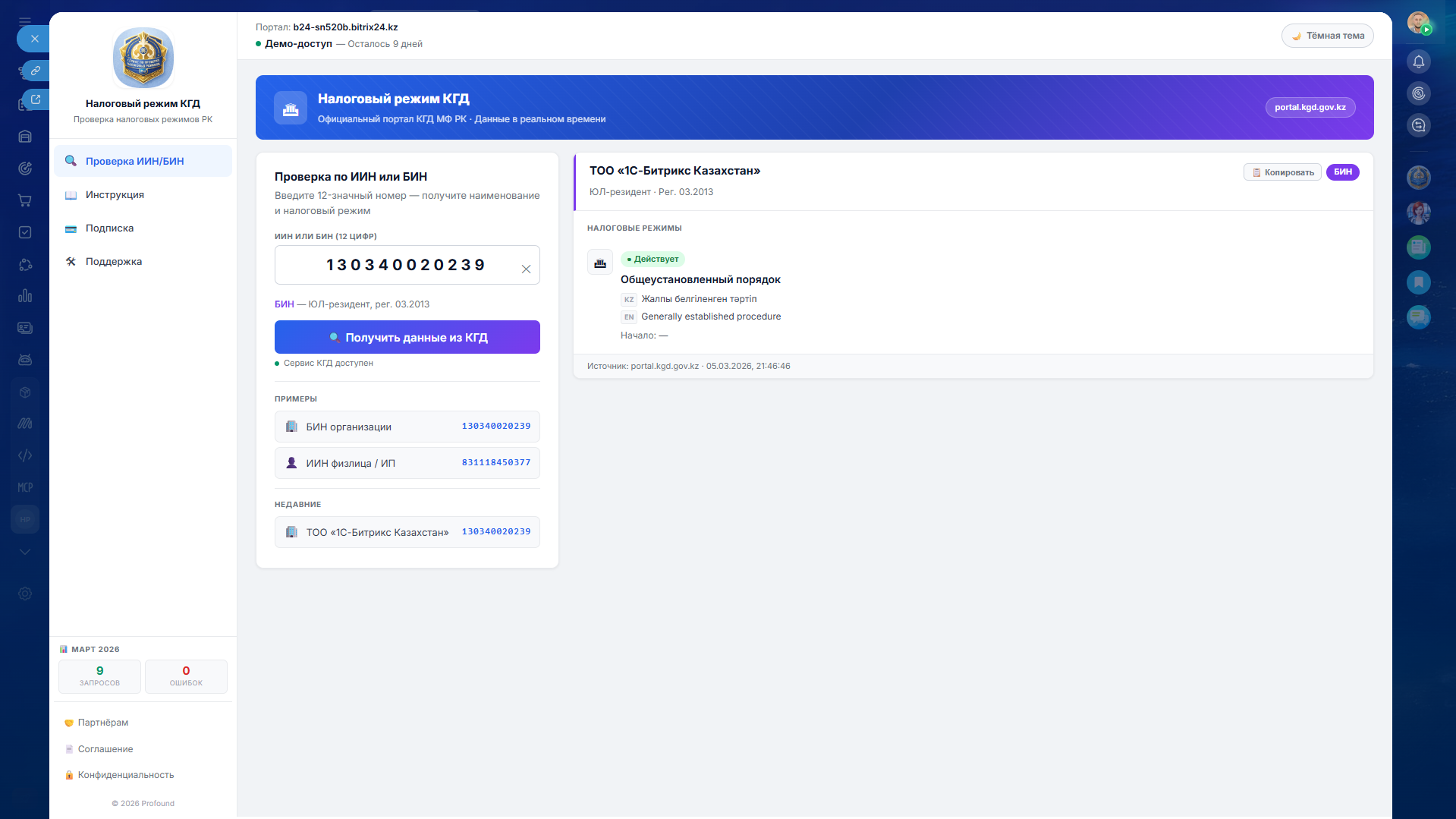 Приложение «Проверка налогового режима КГД МФ РК» позволяет быстро определить налоговый режим компании или индивидуального предпринимателя по ИИН или БИН на основе данных Комитета государственных доходов Республики Казахстан (КГД) прямо в CRM.