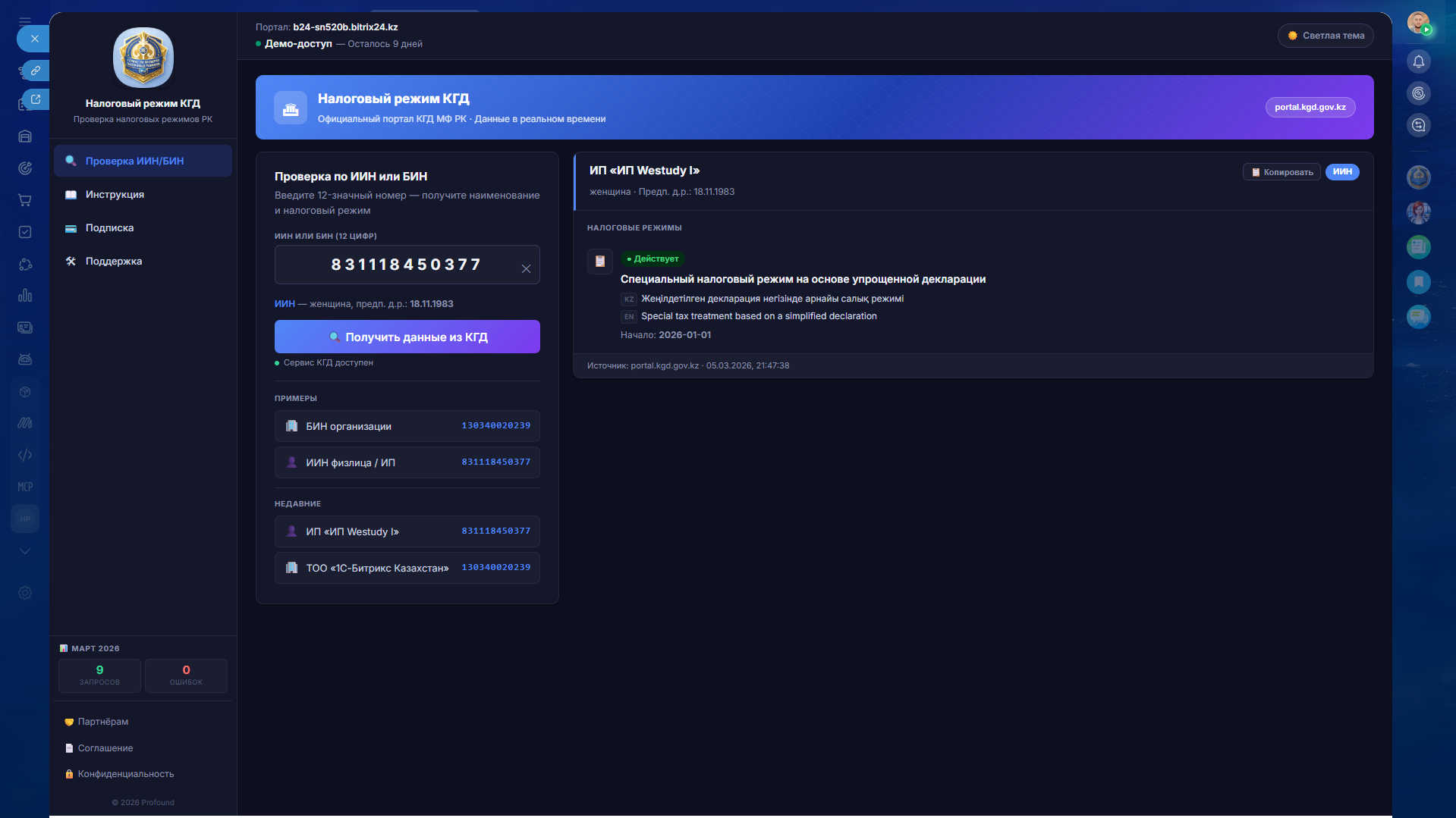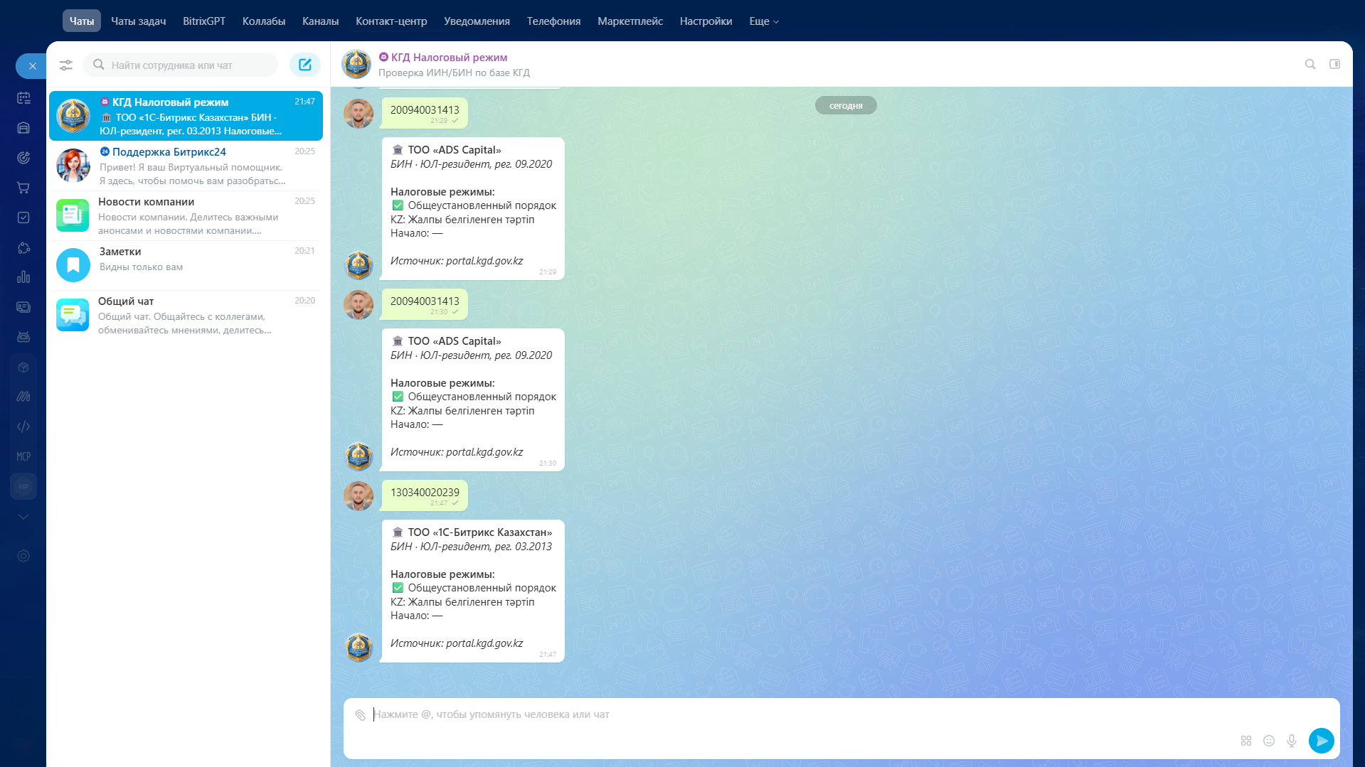 Достаточно отправить боту ИИН или БИН, и он автоматически выполнит проверку налогового режима по данным КГД и отправит результат в чат.
