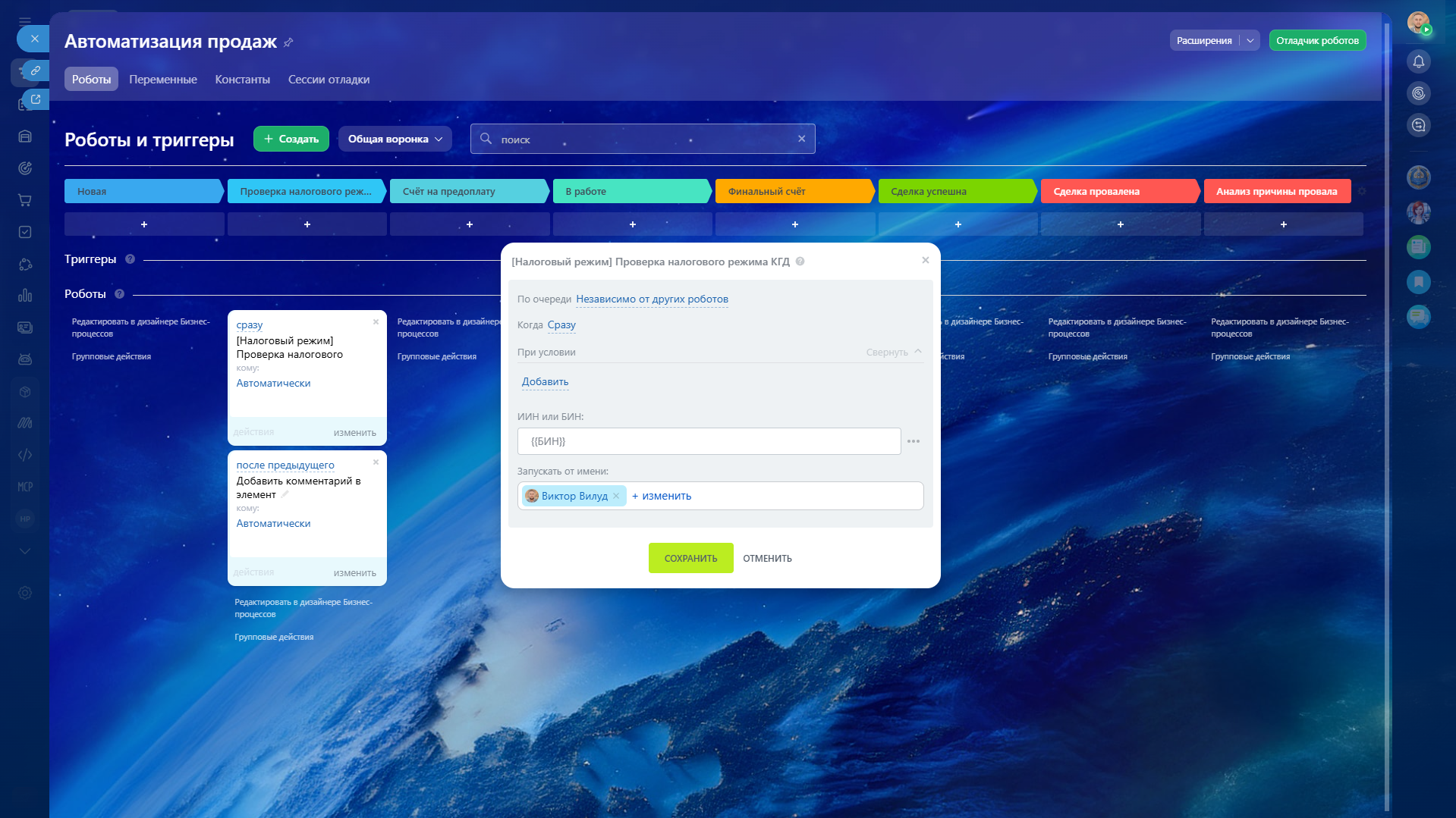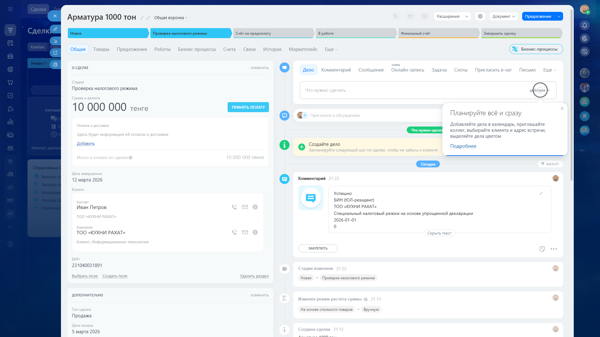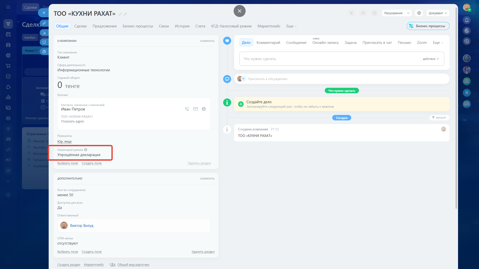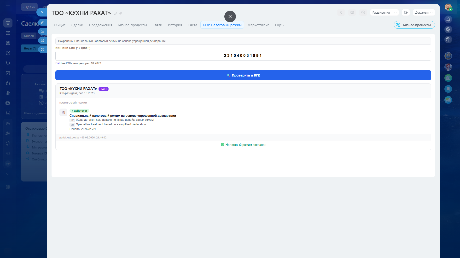После сохранения данные записываются в пользовательское поле «Налоговый режим (КГД)» и остаются доступными для дальнейшей работы в CRM.