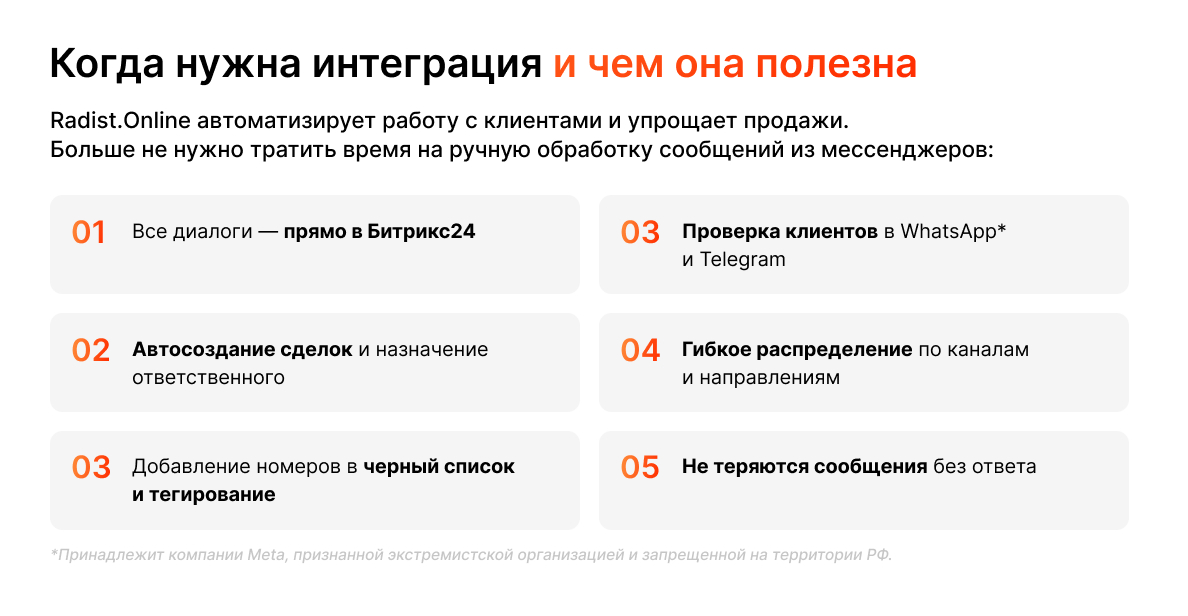 Работайте с сообщениями клиентов прямо внутри CRM-системы — без переключений между вкладками и сторонними сервисами. Бесплатное приложение Окно чатов встроено в интерфейс RadistWeb, который запускается в Битрикс24 и позволяет вести диалоги с клиентами в контексте сделки.