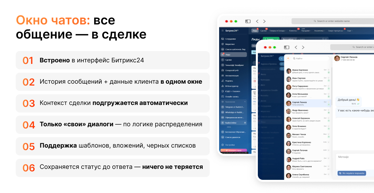 Окно чатов Radist.Online — чаты, сделки и контакты вместе.