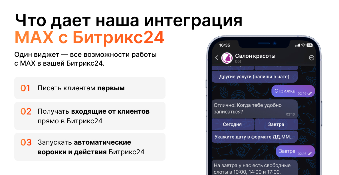 MAX + Битрикс24 — пишите клиентам первыми, автоматизируйте продажи, контролируйте бизнес. Все в одном окне.