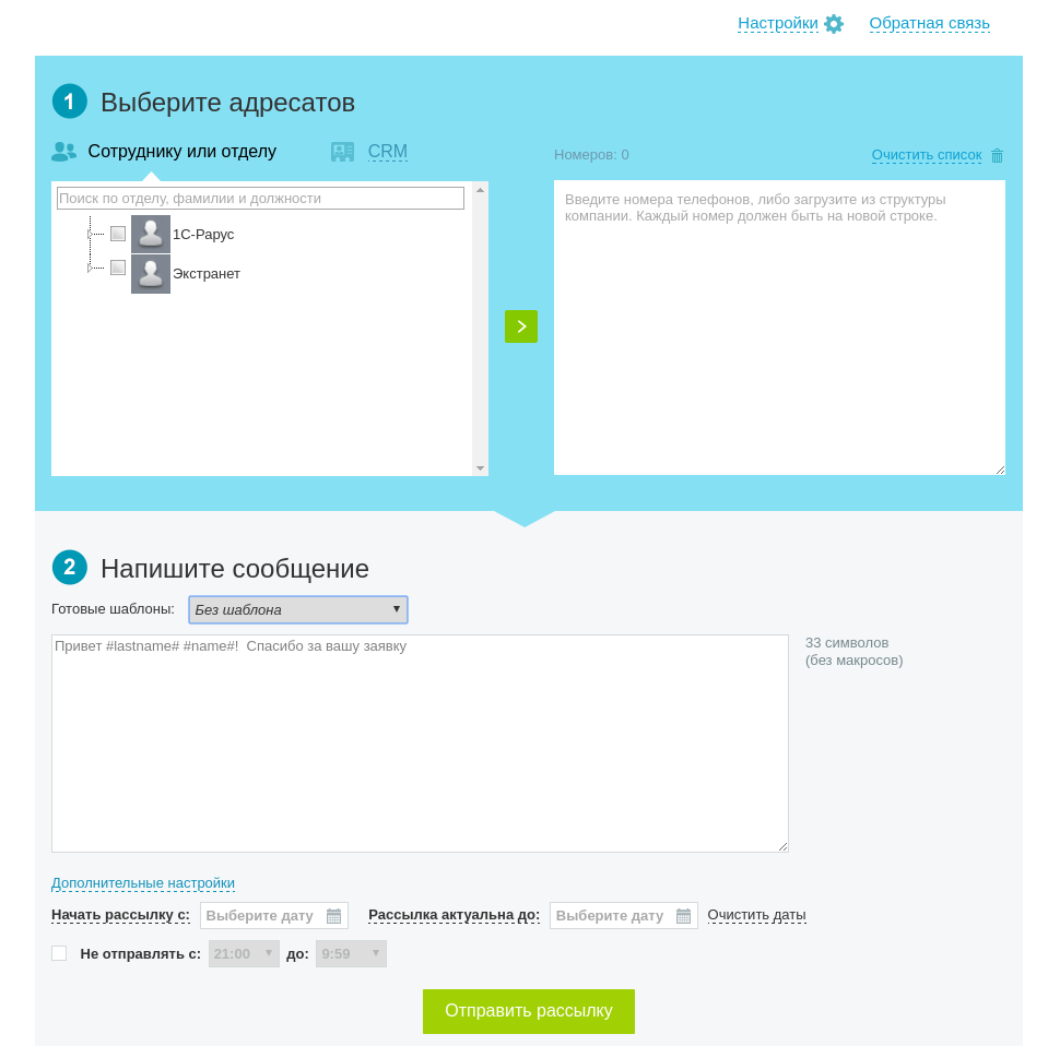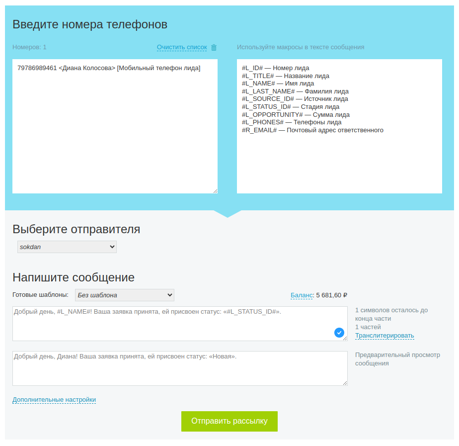 - Отправка массовых SMS рассылок через внутренний интерфейс приложения.