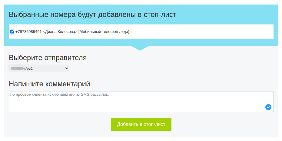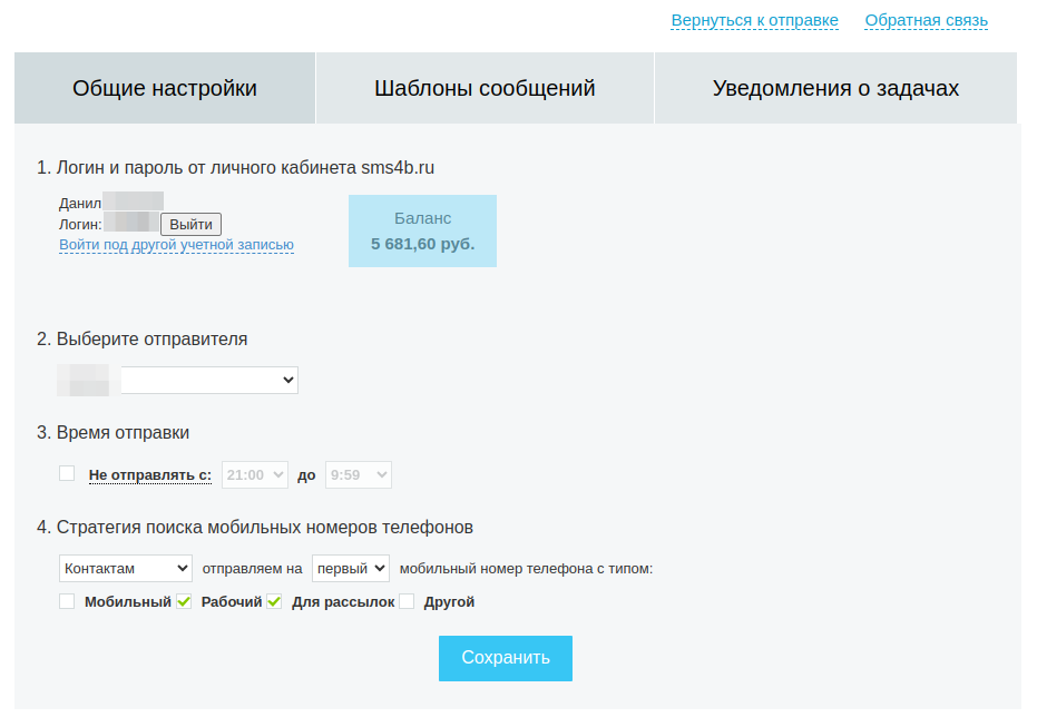- Выбор SMS-имени отправителя.
