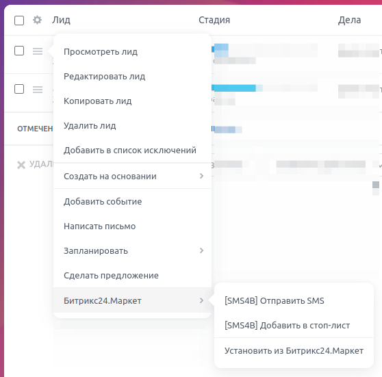 - Интеграция с SMS-провайдерами портала для рассылок через карточки сущностей CRM и модуль «Маркетинг».