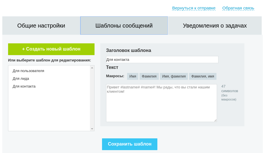 - Поддержка шаблонов сообщений для частых рассылок.
