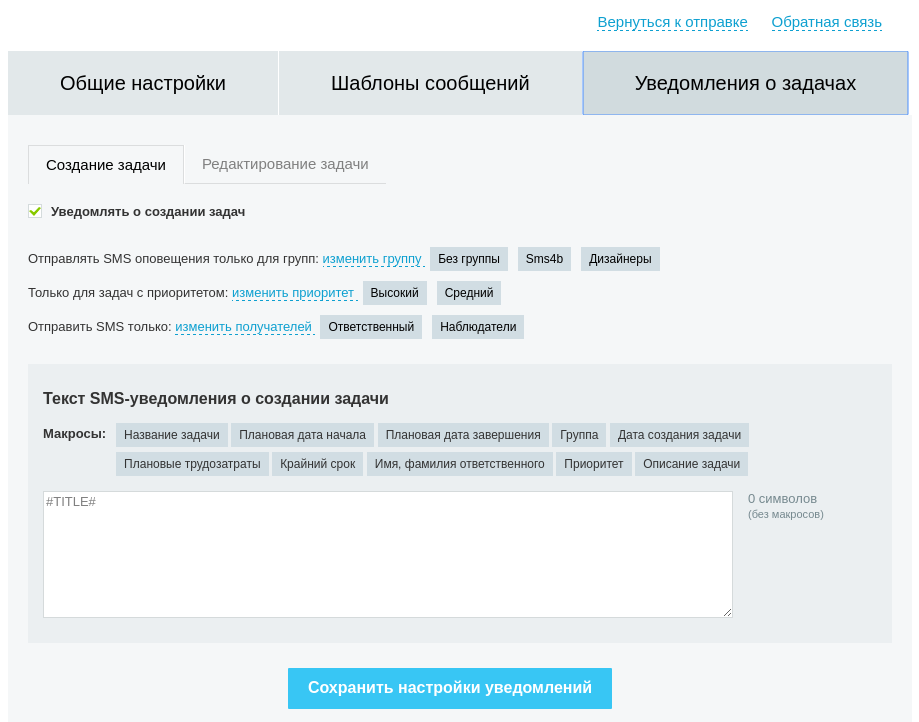 - Отправки SMS при создании и изменении задач.