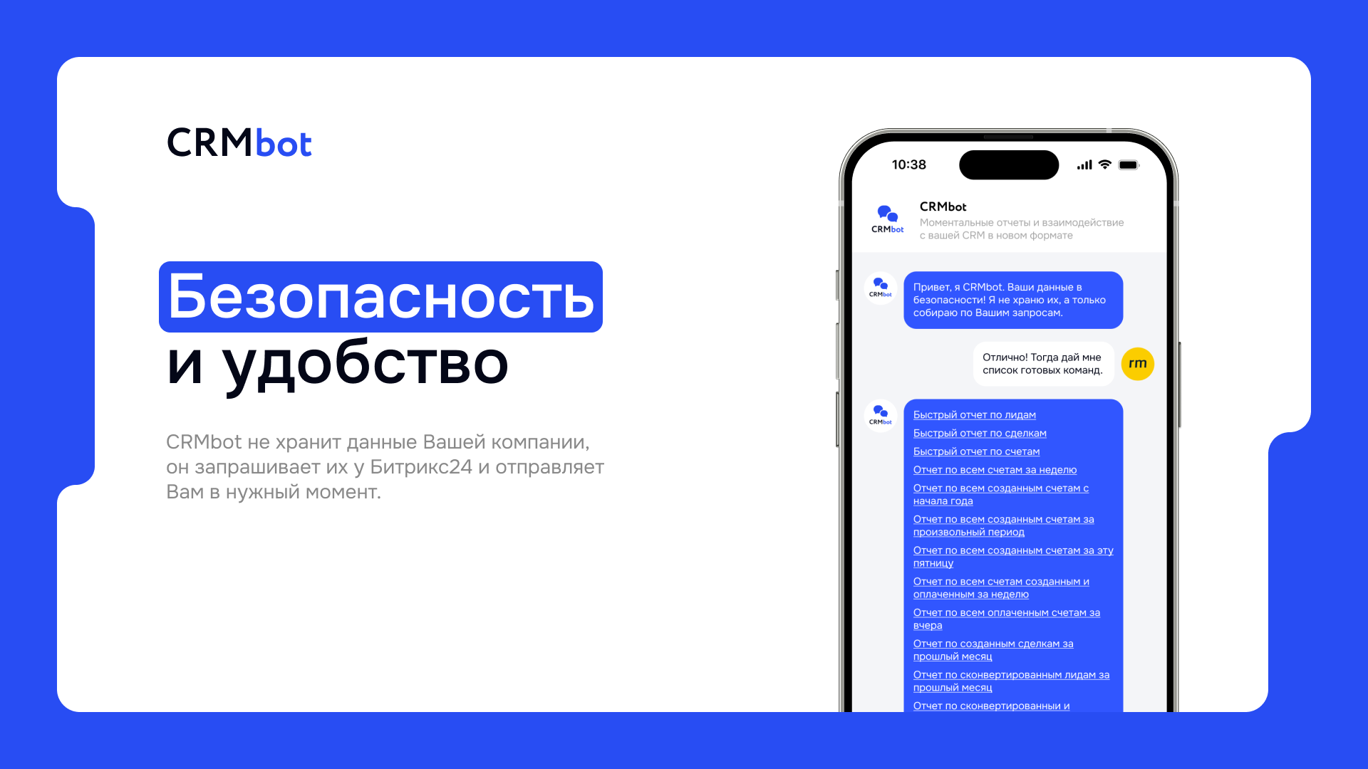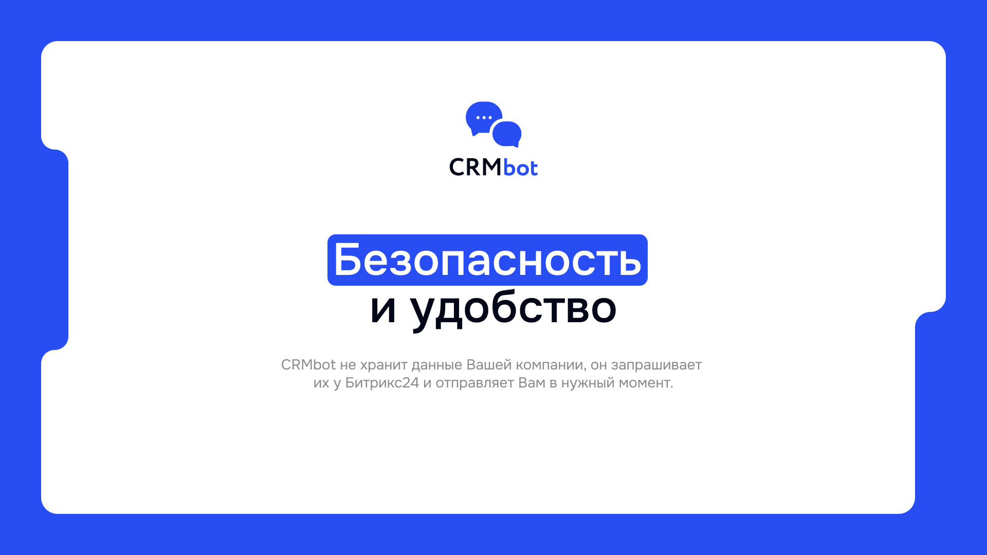 CRMbot не хранит данные Вашей компании, а запрашивает данные у Битрикс24 и отправляет Вам в нужный момент.