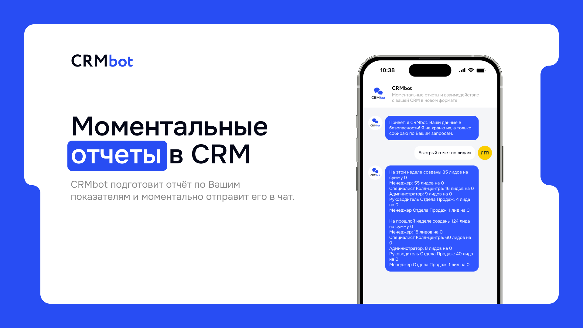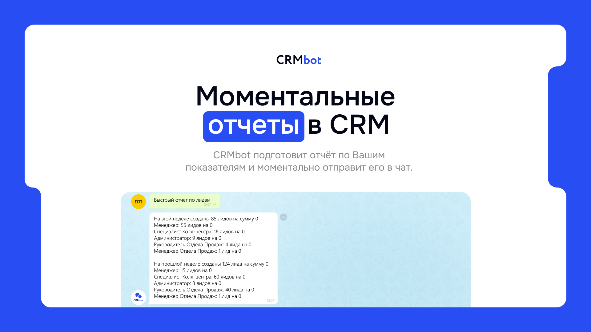 CRMbot подготовит нужный отчёт — по лидам, сделкам, счетам или сотрудникам за выбранный период, и моментально отправит вам в чат.