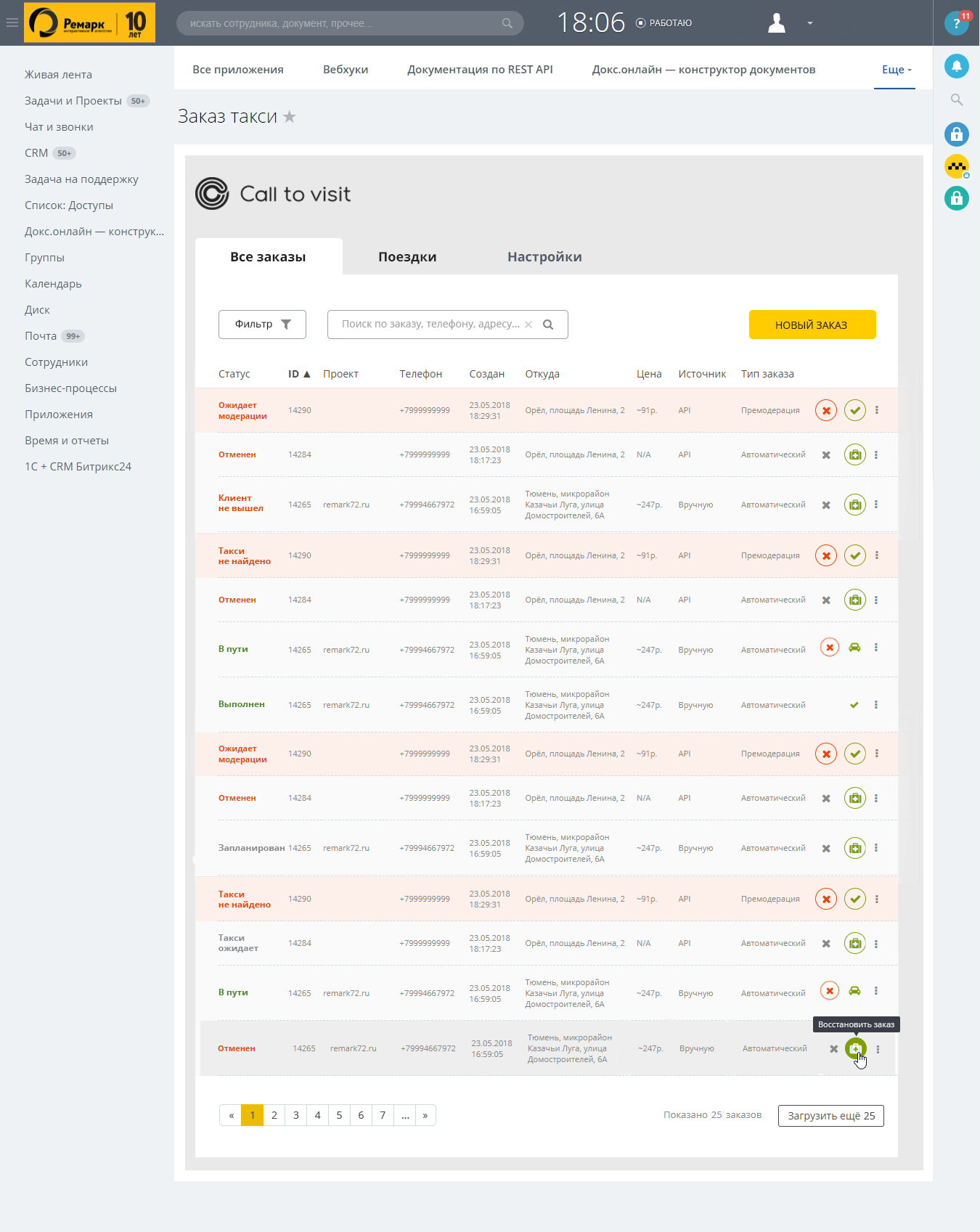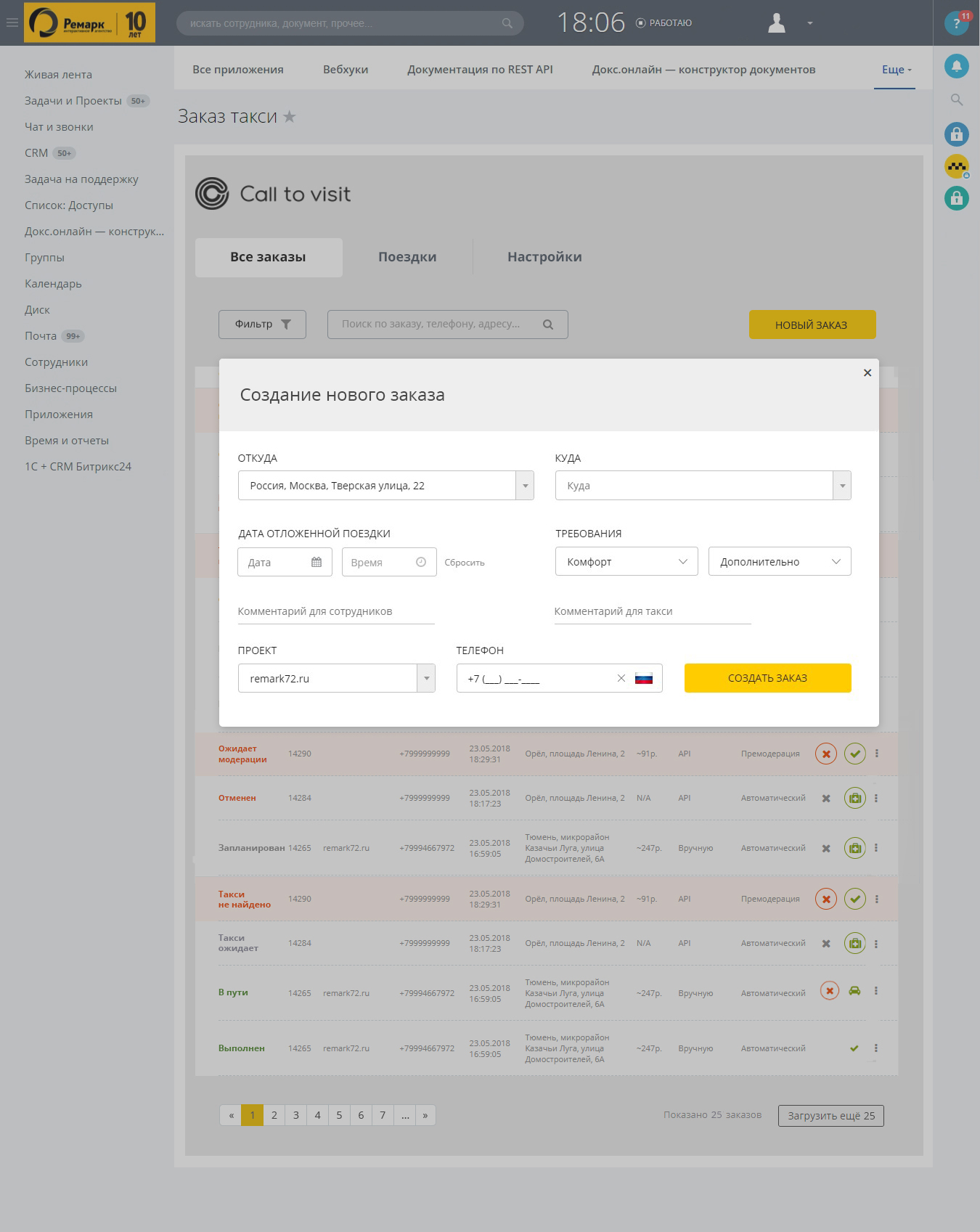 После создания заказ попадает в службу Яндекс.Такси. При каждом изменении статуса заказа менеджеру на портале отправляется уведомление о текущем статусе поездки.