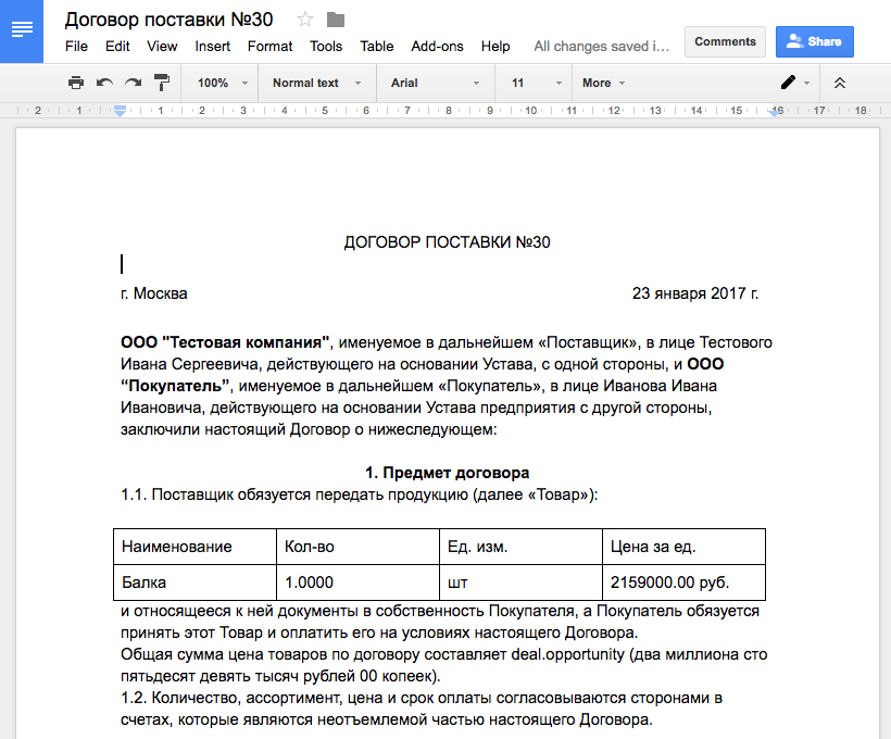 Генерируйте договоры, коммерческие, акты, счета в 2 клика по заранее заготовленному шаблону.