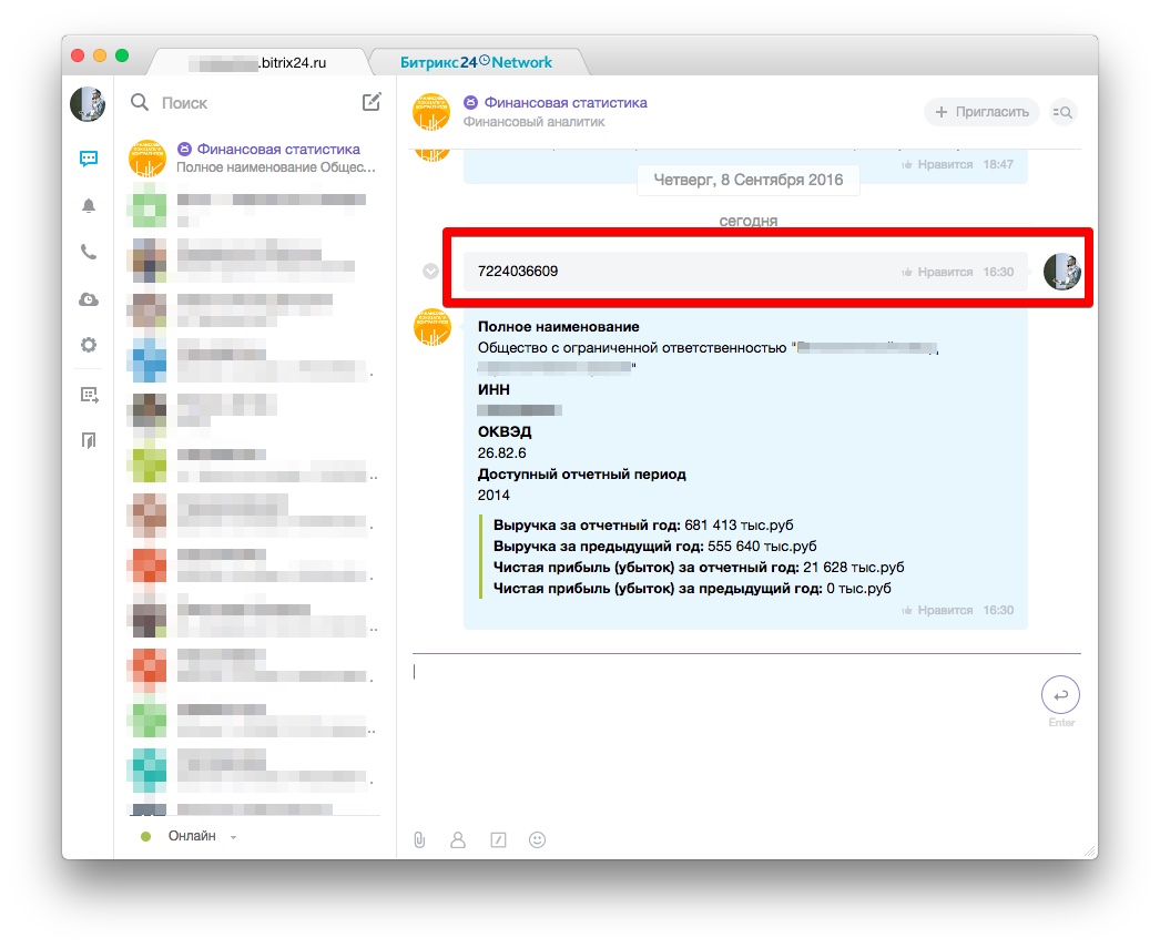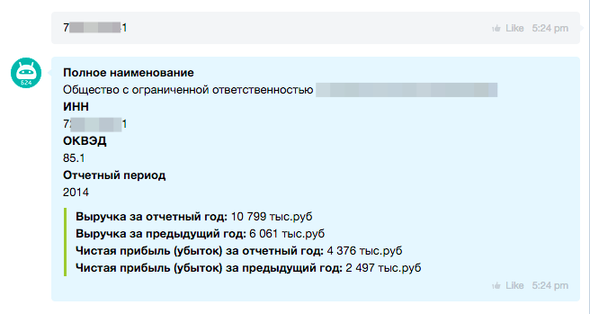 Чат-бот Финансовая статистика контрагента осуществляет поиск по базе российских организаций и индивидуальных предпринимателей и предоставляет информацию об их бухгалтерской отчетности. Вы просто вводите ИНН — и получаете информацию о годовой выручке и прибыли.