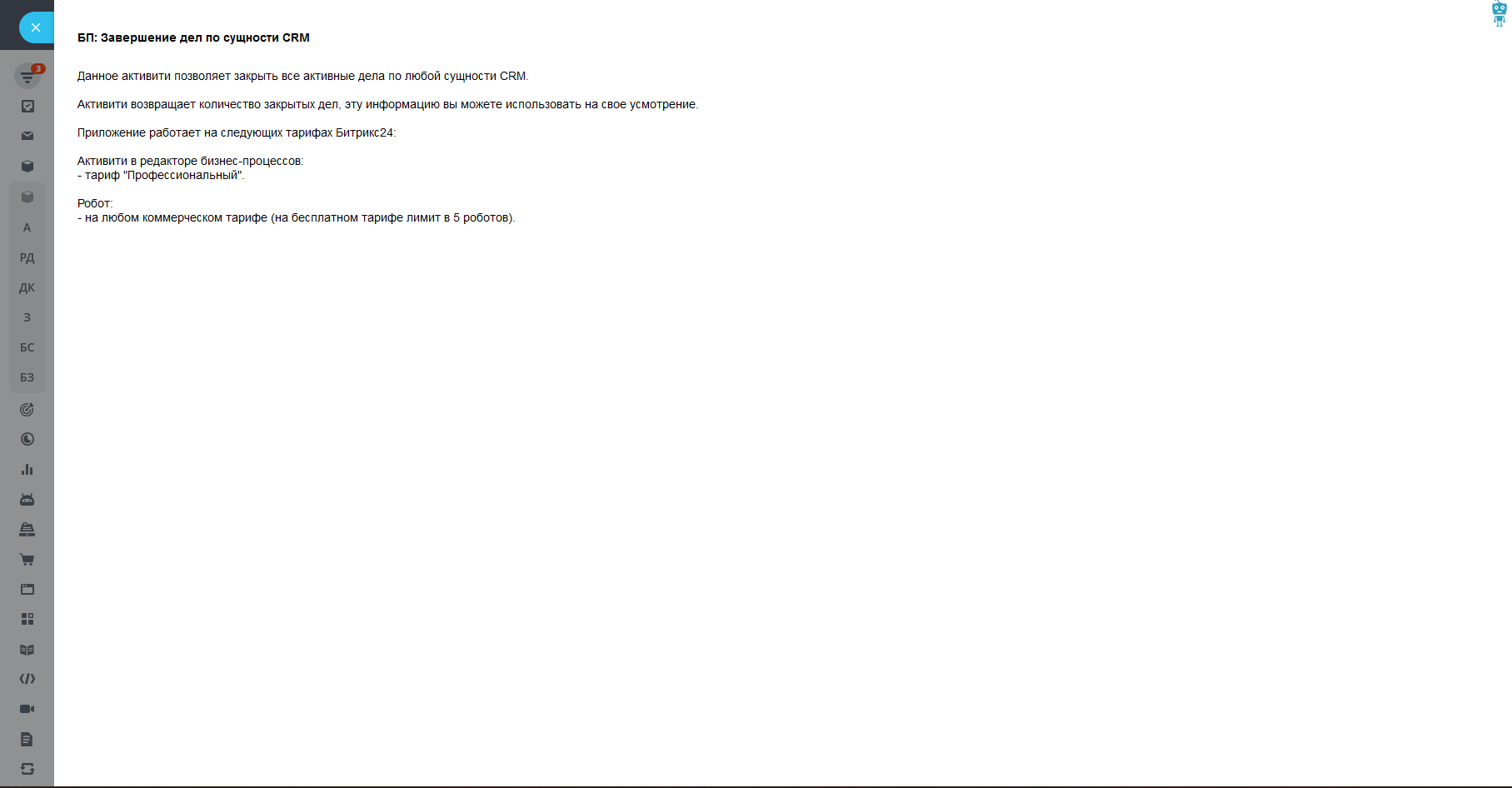 "Данное активити позволяет закрыть все активные дела по любой сущности CRM." Не работает... ещё