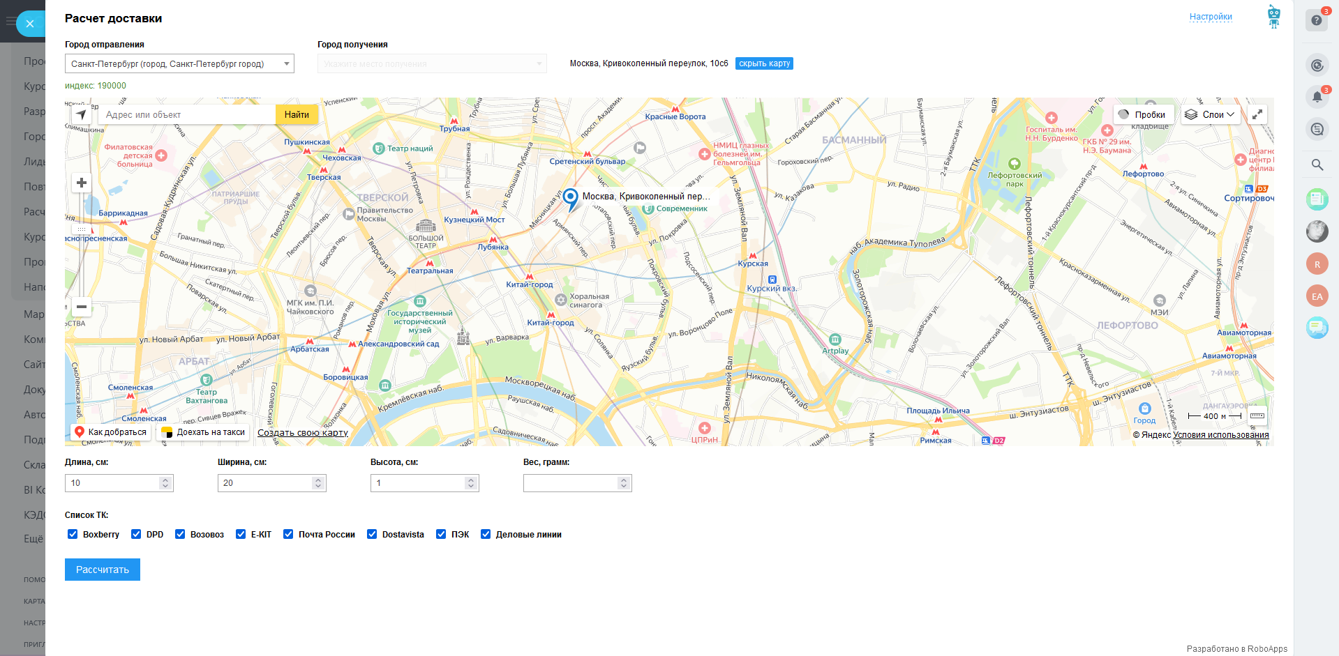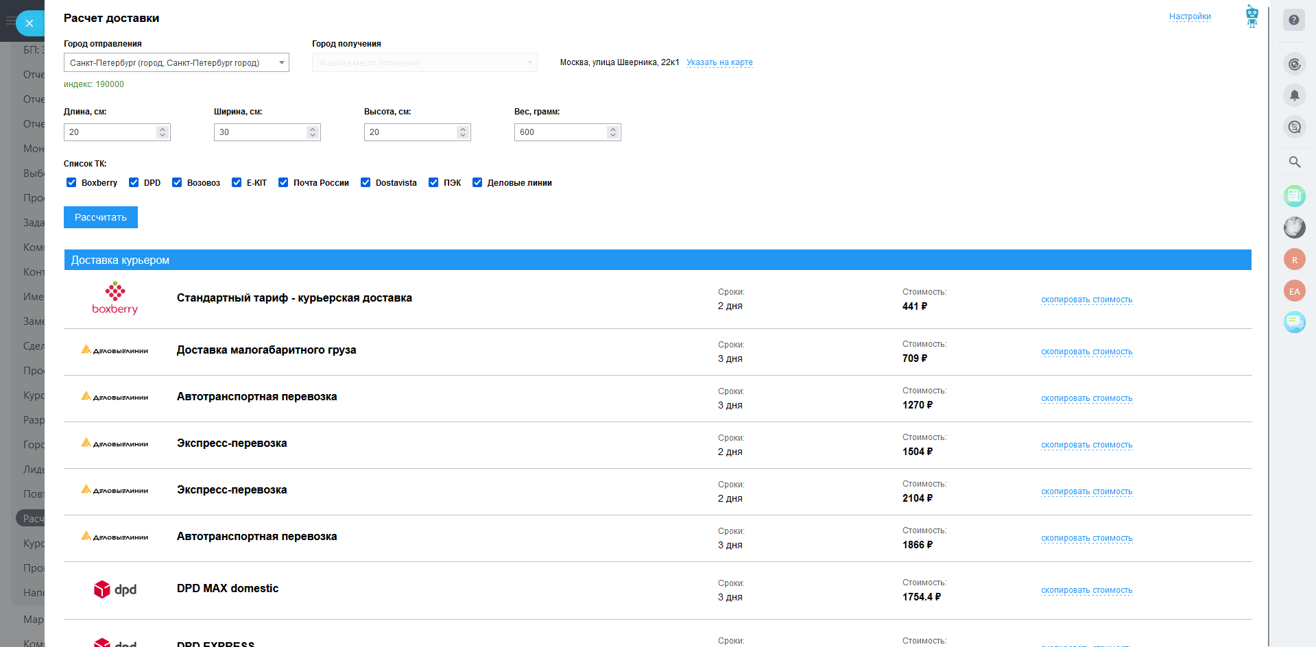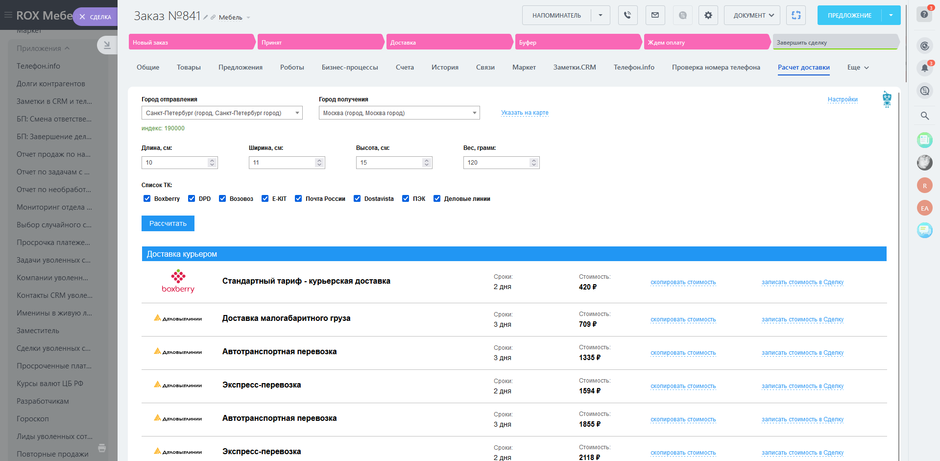 С помощью приложения "Расчёт доставки" вы сможете узнать стоимость и сроки доставки разных транспортных компаний прямо внутри вашего Битрикс24.