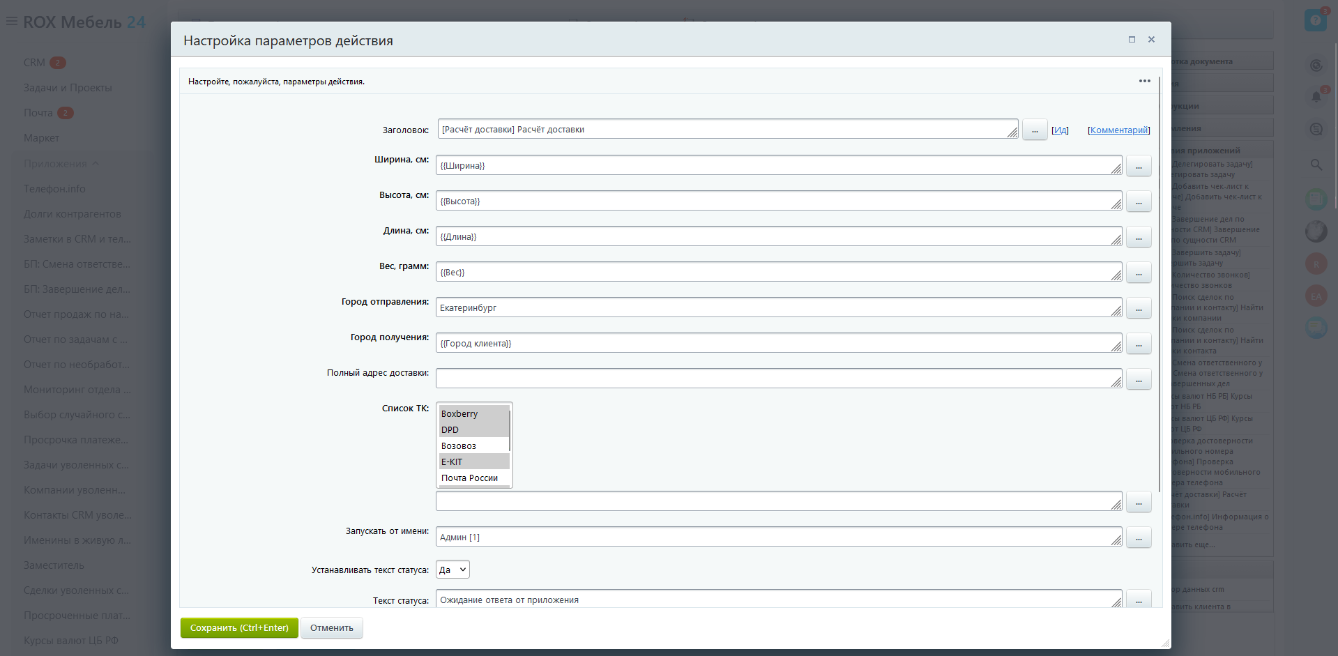 Также в настройках приложения находится галочка с установкой активити или действия робота, которое позволяет произвести расчет доставки через бизнес процессы или робота в зависимости от возможностей вашего тарифа Битрикс24.