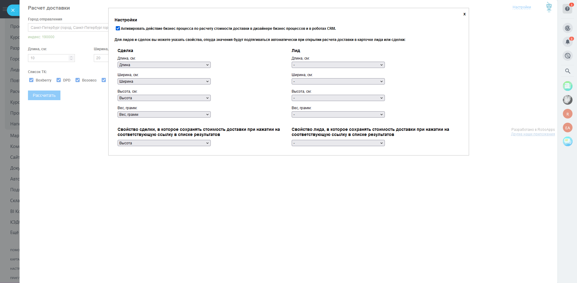 Настройки приложения позволяют автоматически подтягивать параметры груза (длину, ширину, высоту, вес) из карточки сделки или лида, для этого в настройках приложения нужно указать соответствующие поля: