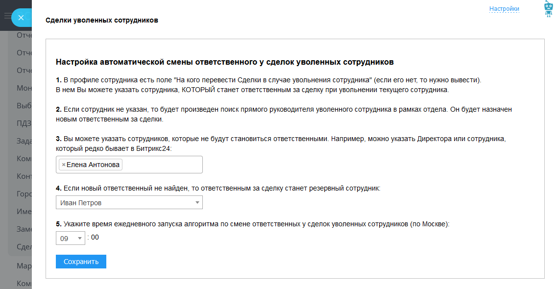 - Настроить ежедневную смену ответственного у сделок при увольнении сотрудника.