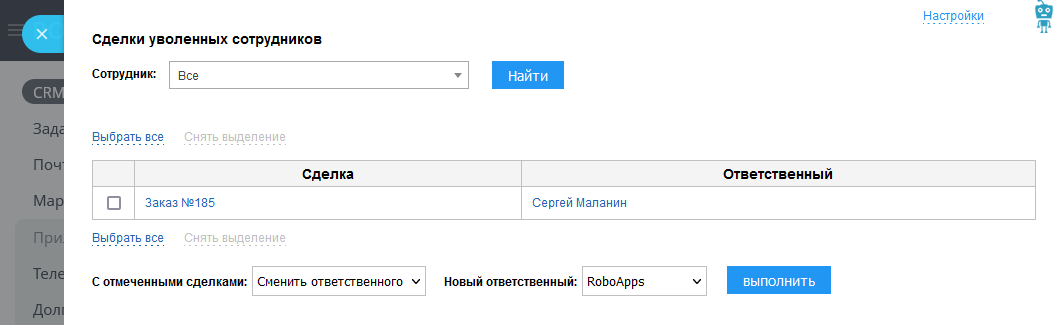 Приложение позволяет увидеть сделки уволенных сотрудников одним списком, а также настроить смену ответственного за сделку при увольнении сотрудника.