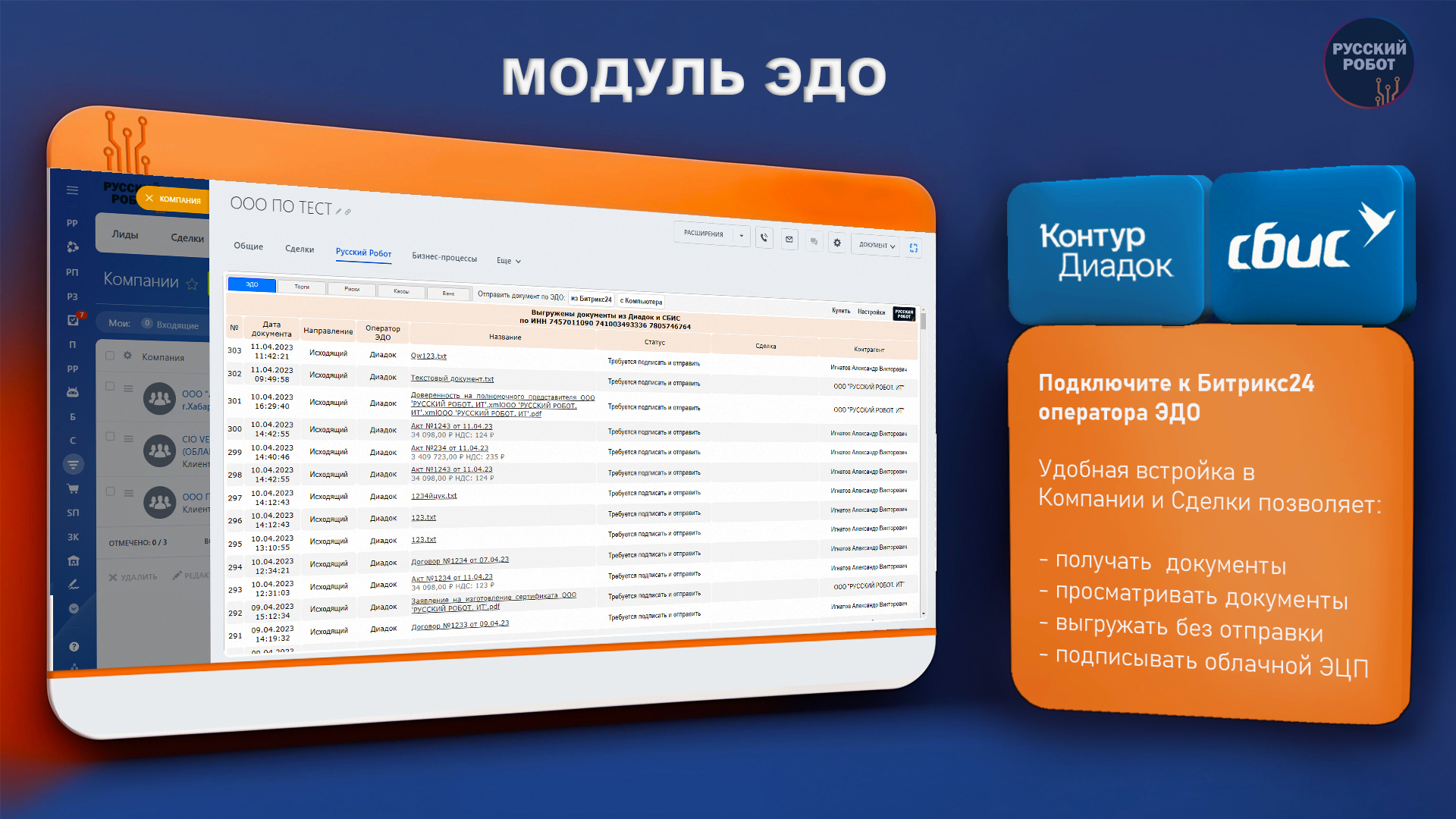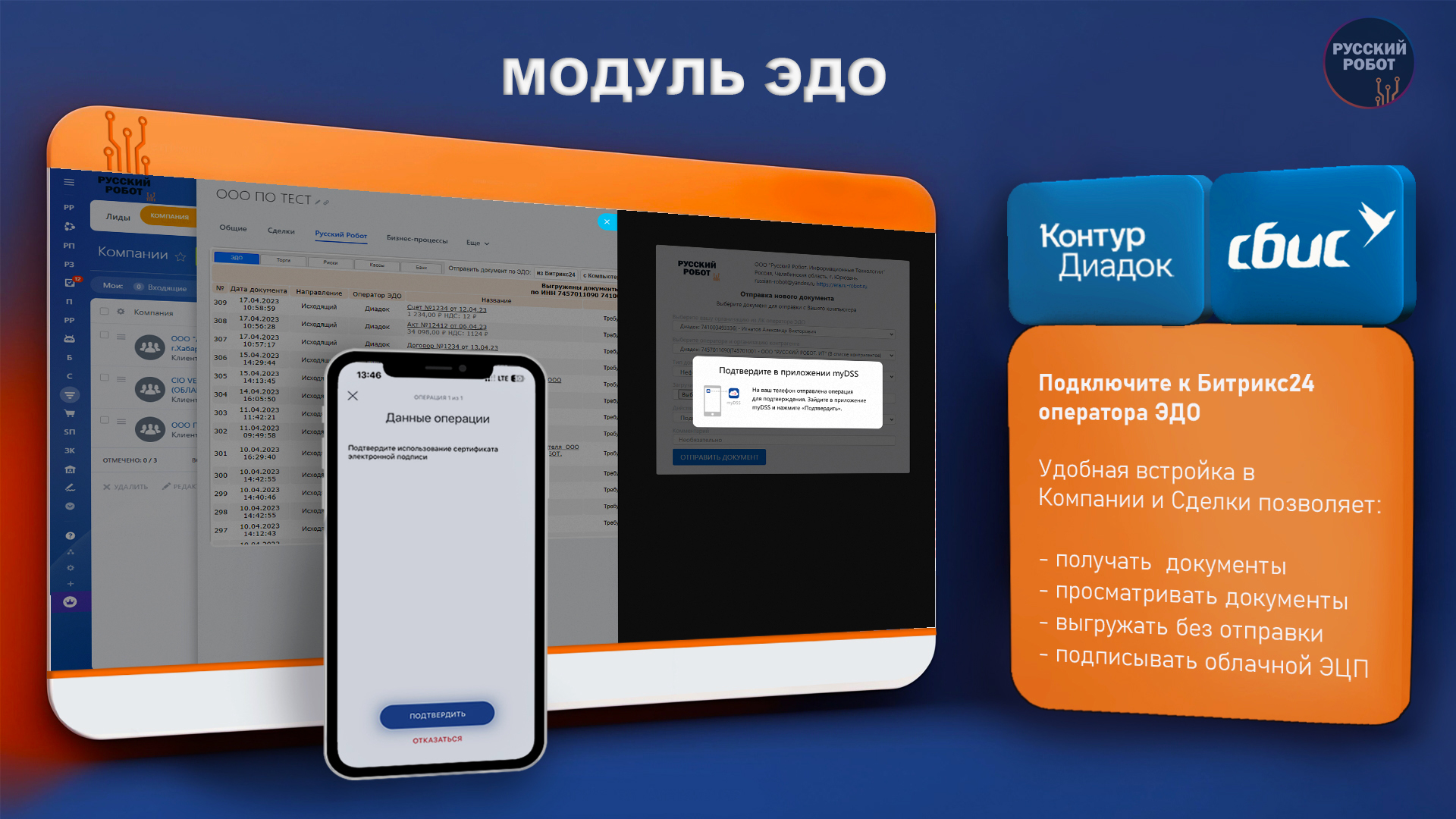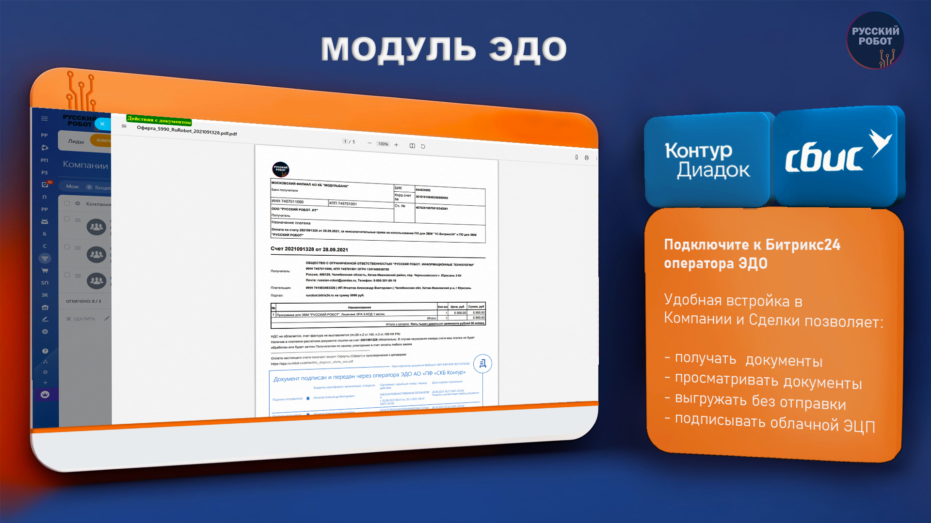 - подключить к Битрикс24 операторов электронного документооборота, Контур.Диадок и СБИС;