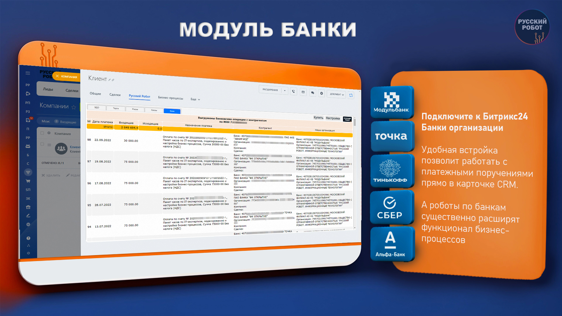 - получать и просматривать перечень банковских операции прямо в карточке Компании или Сделки;