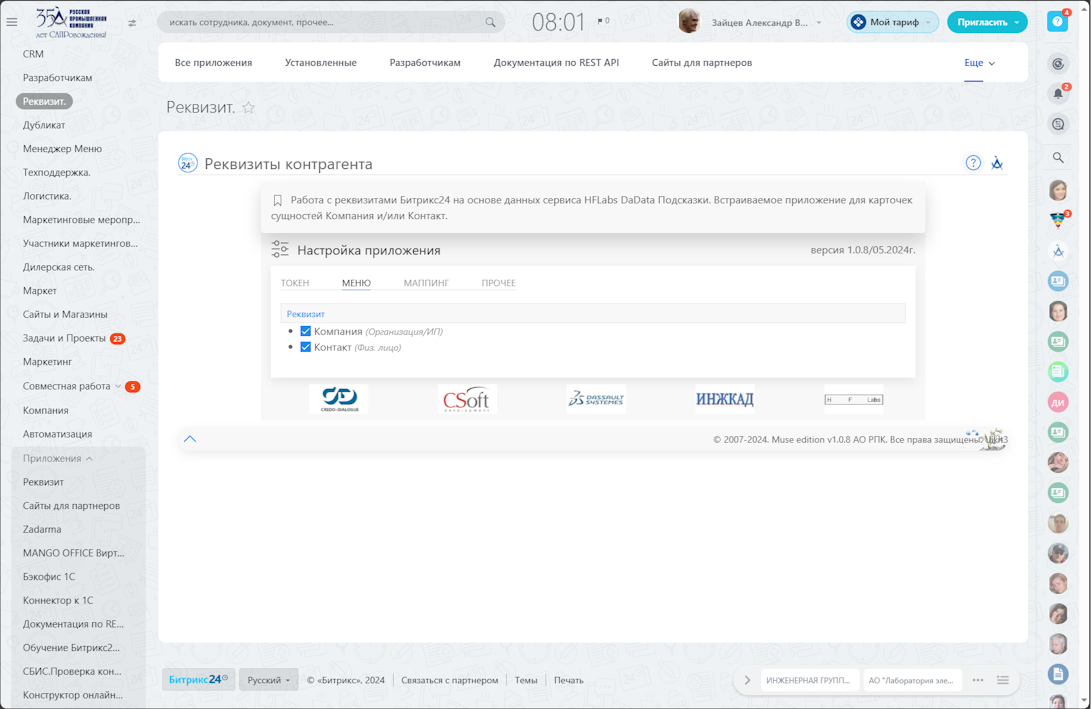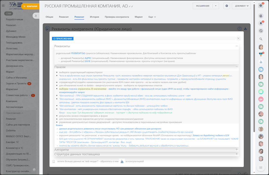 Работа с реквизитами Битрикс24 на основе данных сервиса HFLabs DaData Подсказки (Россия/Беларусь/Казахстан). Встраиваемое приложение для карточек сущностей Компания и/или Контакт.