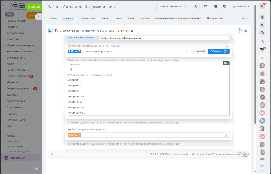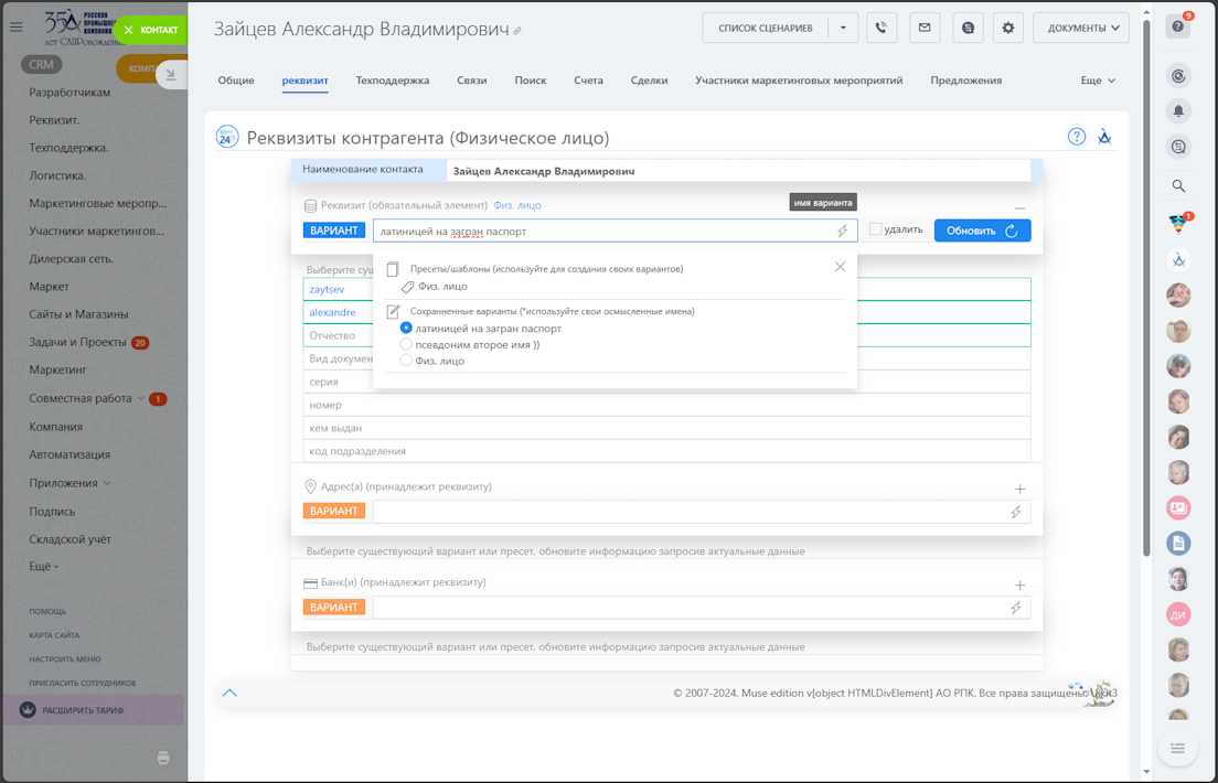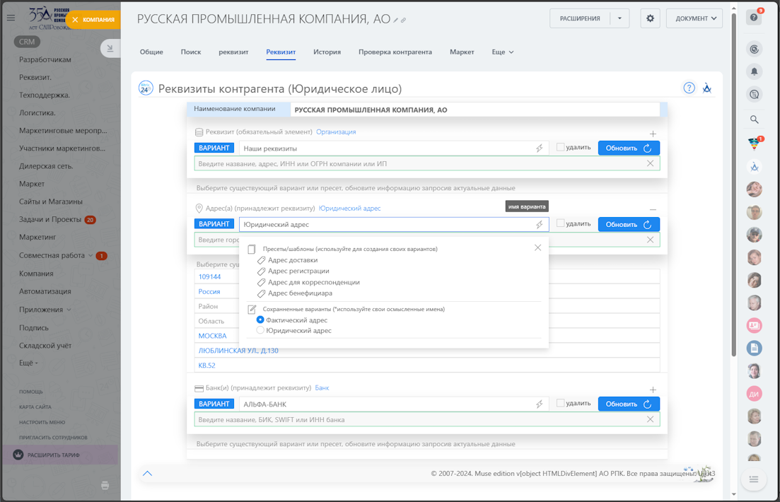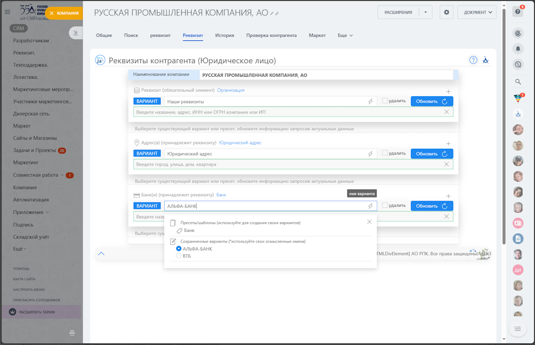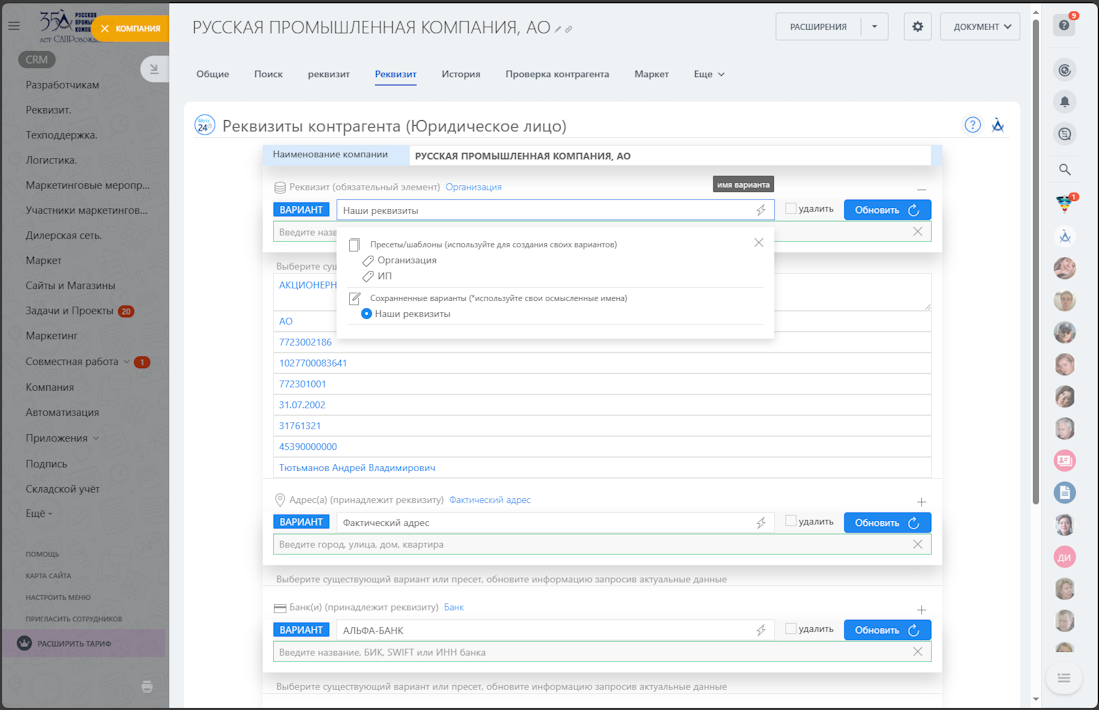 - пресеты ограничены типом сущности (компаниям - Организация/ИП, контактам - Физ. лицо)