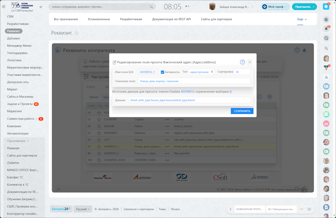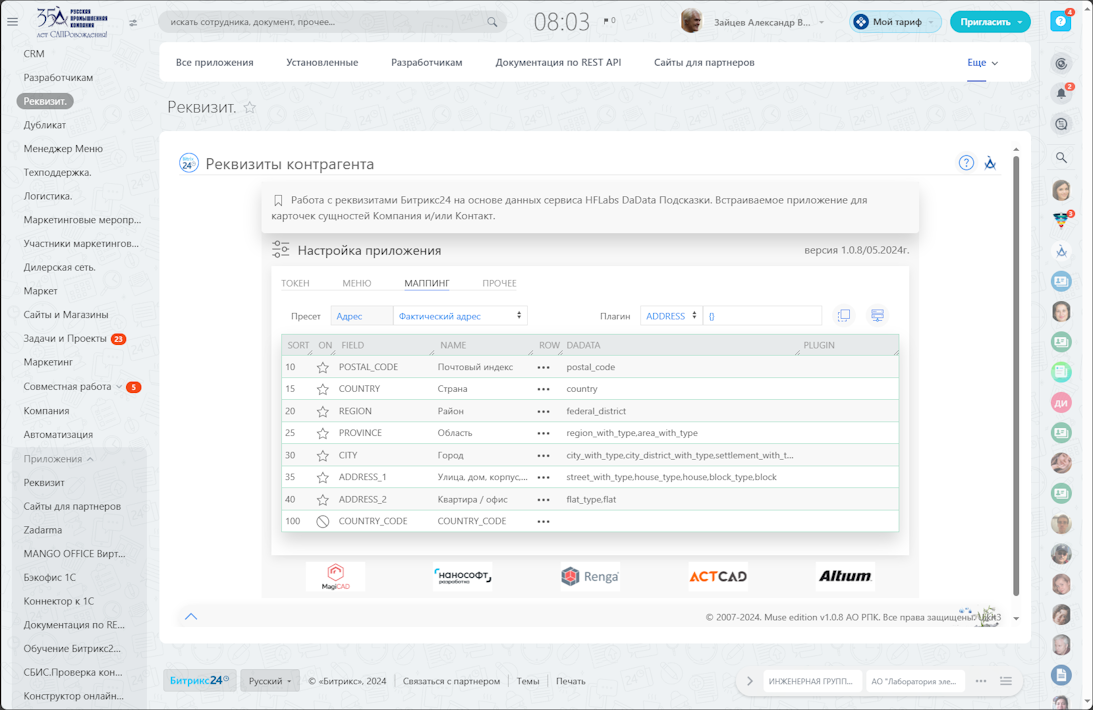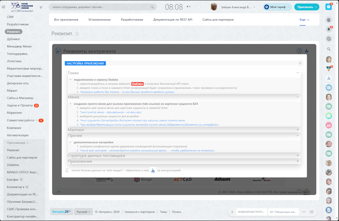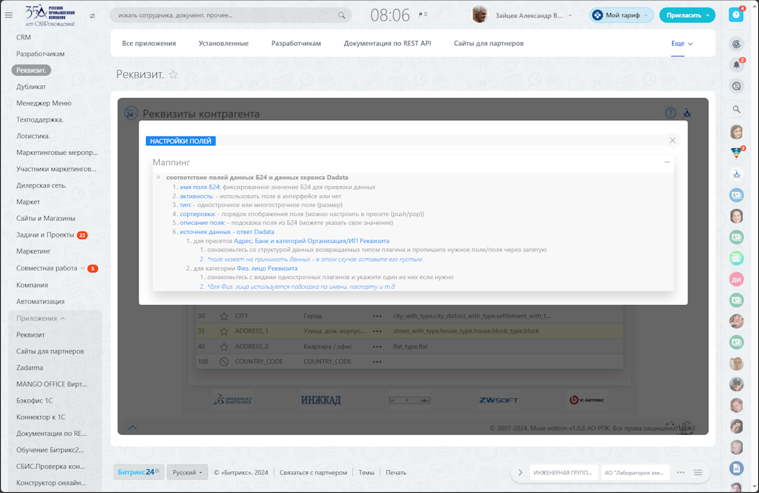 - пресеты и маппинг полей настраиваются в приложении на момент инсталляции на портале, доступно обновление по текущей информации Битрикс24 по реквизитам и полям (в том числе кастомным)