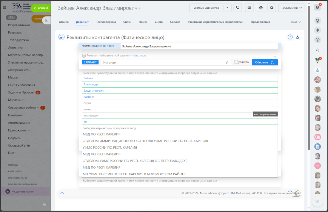 - создание/обновление контактного лица на основе данных сервиса для юридического лица