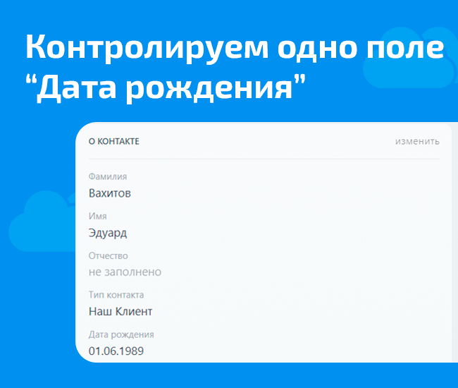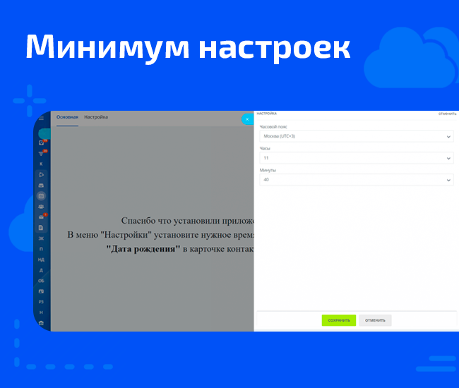 Всего несколько кликов и система сама будет напоминать вам, когда нужно поздравить клиента с днем рождения. Доступно на любых тарифах!